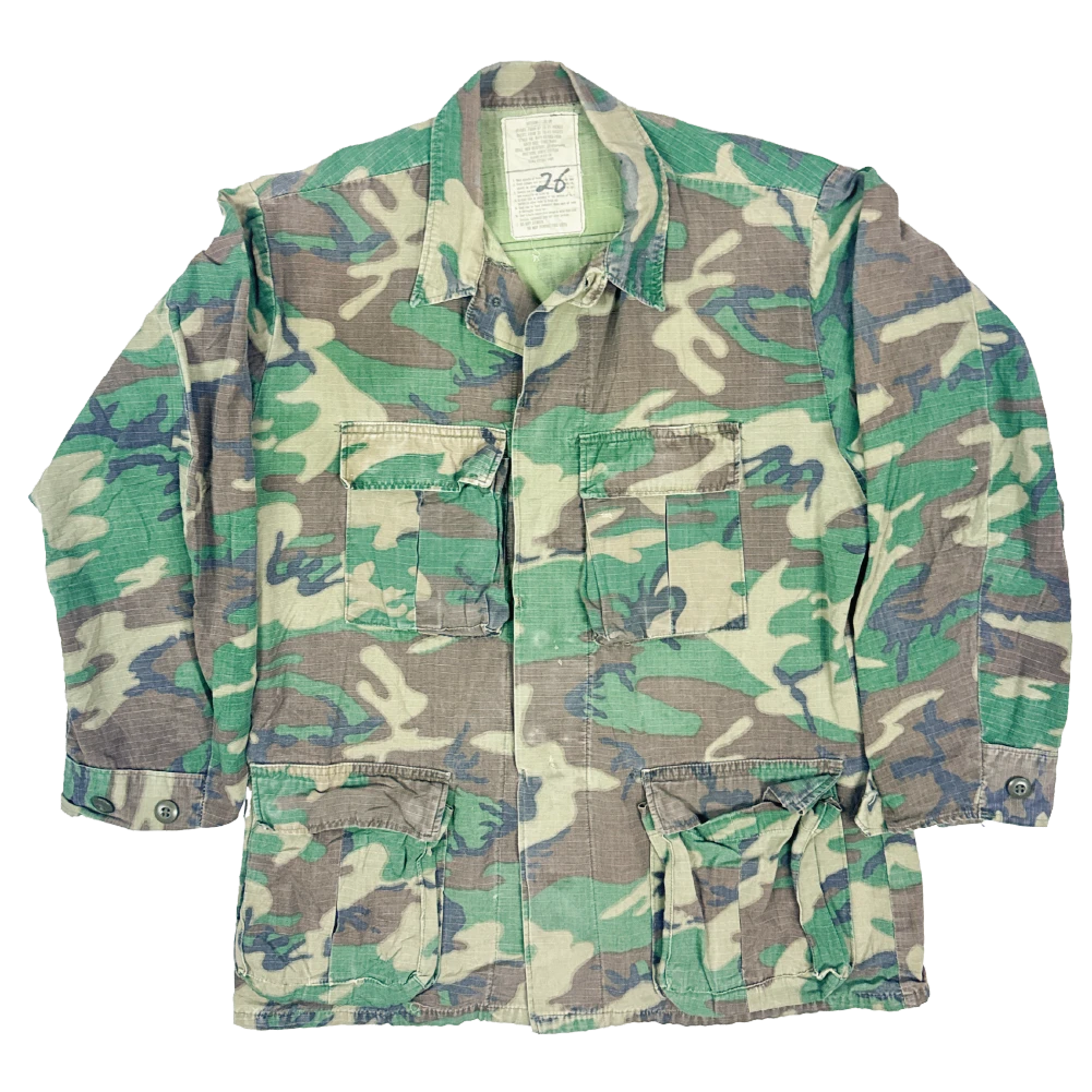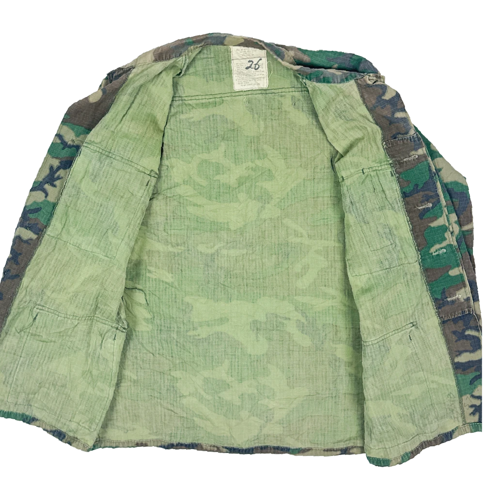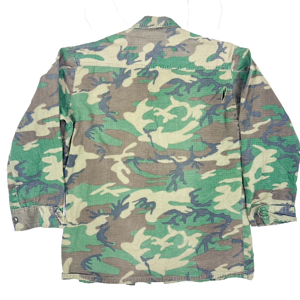 The RDF cut was the follow-up to the US jungle uniform and saw limited use during the late 1970s to early 1980s before replacement by the US BDU in M81 Woodland. This example has a tear where a button was previously fitted and a large tear on the back.