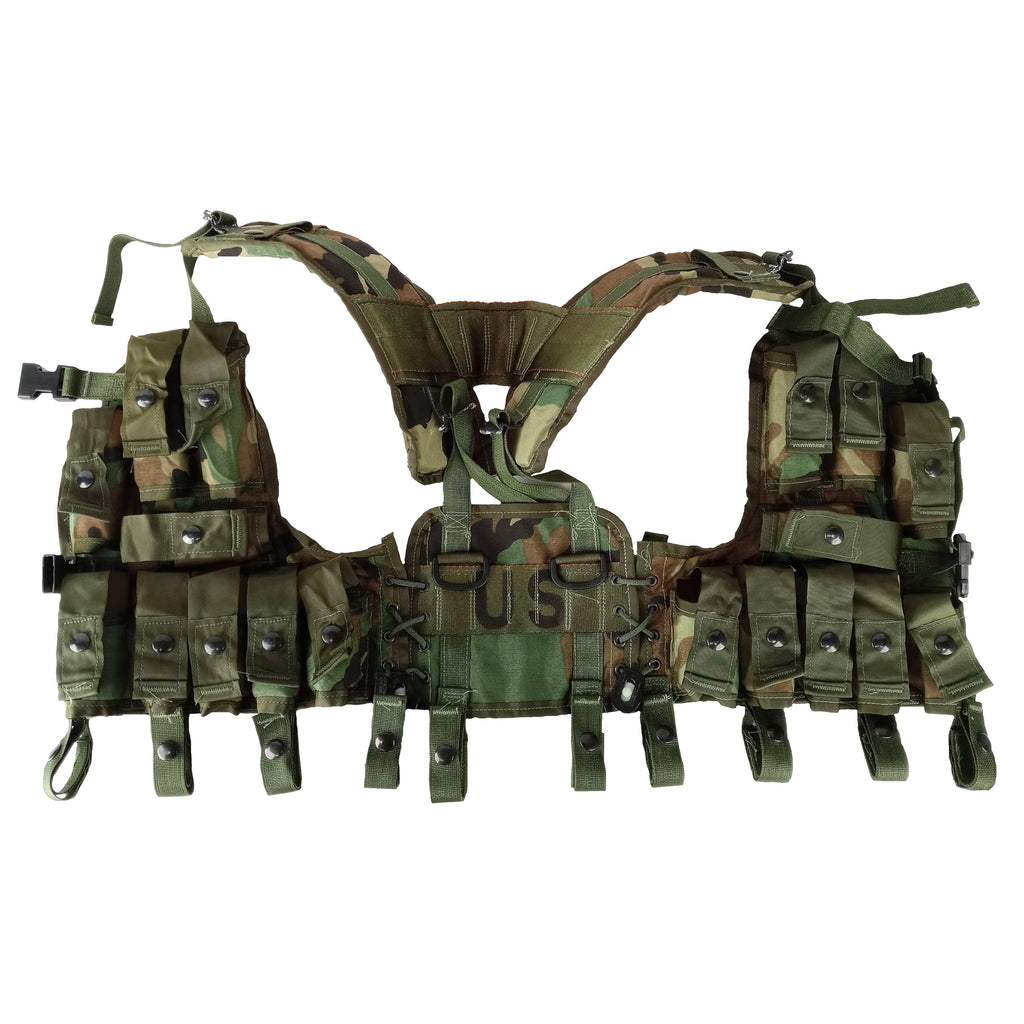 This USGI Woodland Grenade Load Bearing Vest is ideal for carrying 40mm grenades. This vest can hold a total of 14 HE Grenades and 4 x 40mm special purpose grenades in permanently attached grenade pockets. Wear with the standard equipment belt and enjoy a comfortable fit and secure load-bearing with this one-size-fits-most vest.