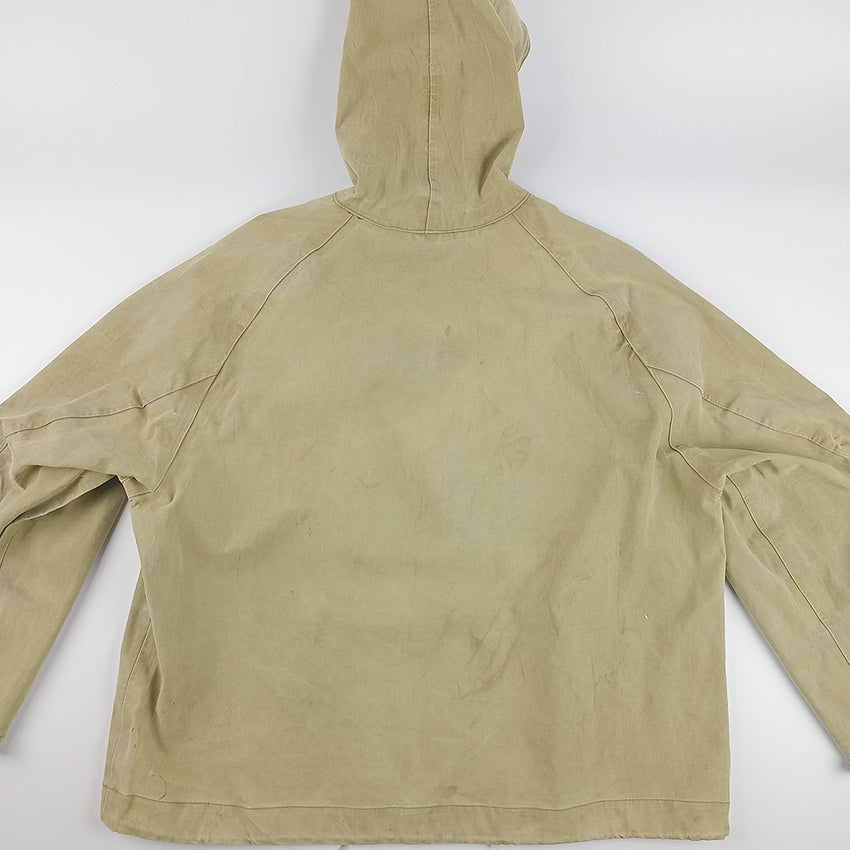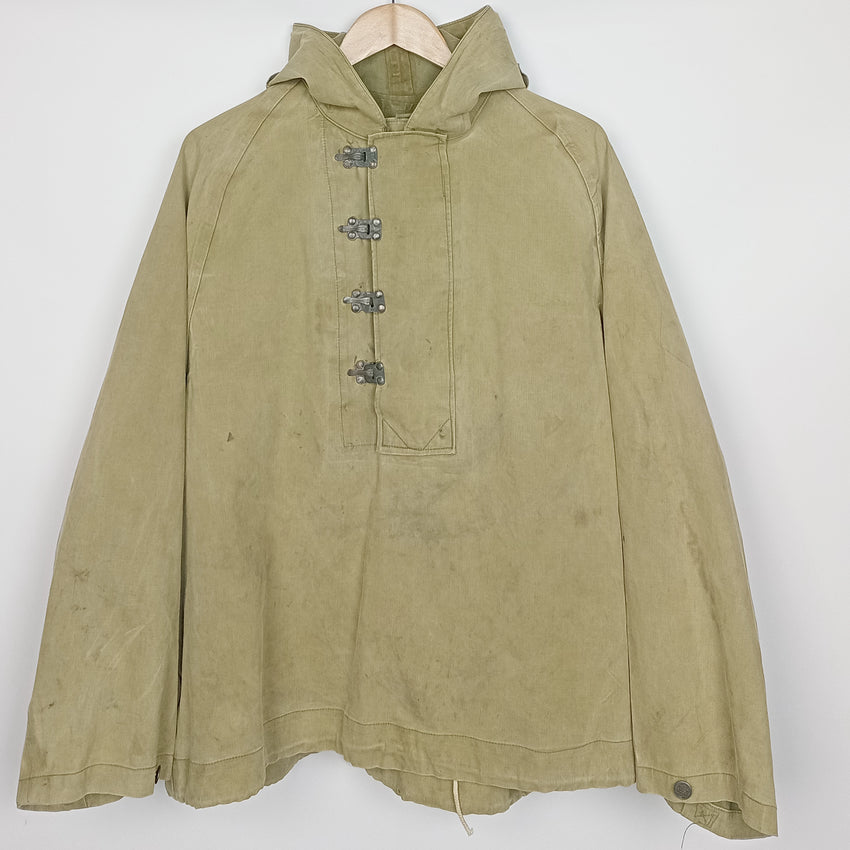 Widely worn by naval landing crews during World War II, including the Normandy landings in 1944, this parka played a vital role in keeping sailors protected during one of history’s most significant amphibious operations. This jacket has a nice overall pale faded colouration with minimal damage, considering it's history. The clip fastenings all work as needed with a satisfying snap closure, deep patina and a little rust. The taped seams are in very good condition and there is only one small (~3cm long) hole to the right sleeve near the cuff. Light stains are present (especially on the lower front) but add to the character. Originally made from rubberised cotton, this has a pleasant suede-like feel. In size Medium, this is a very easy to wear piece. Please buy this so the resident surplus gremlin doesn't.