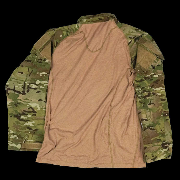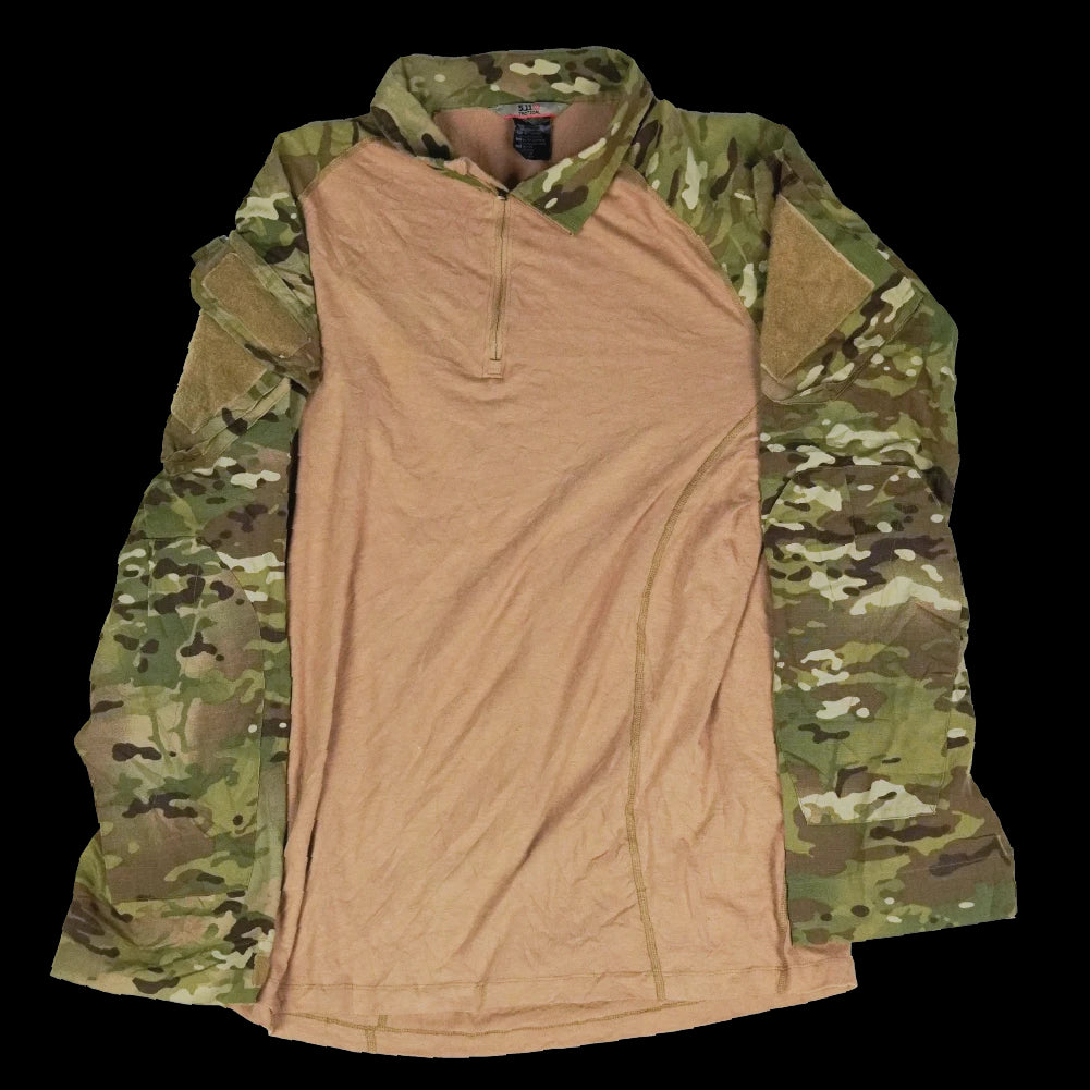 Commercial 5.11 Tactical Rapid Assault Shirt in Multicam. This is a pullover combat-style shirt with a mixed-fabric construction and integrated collar.
