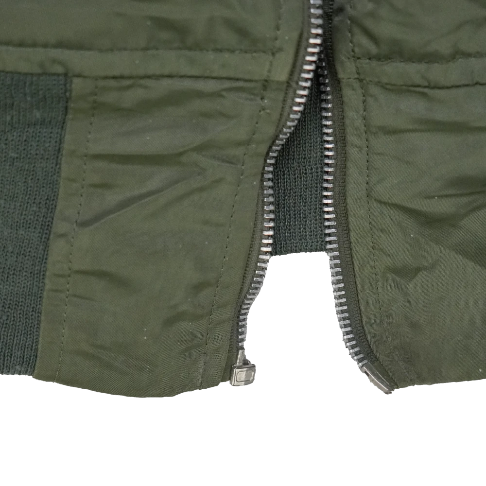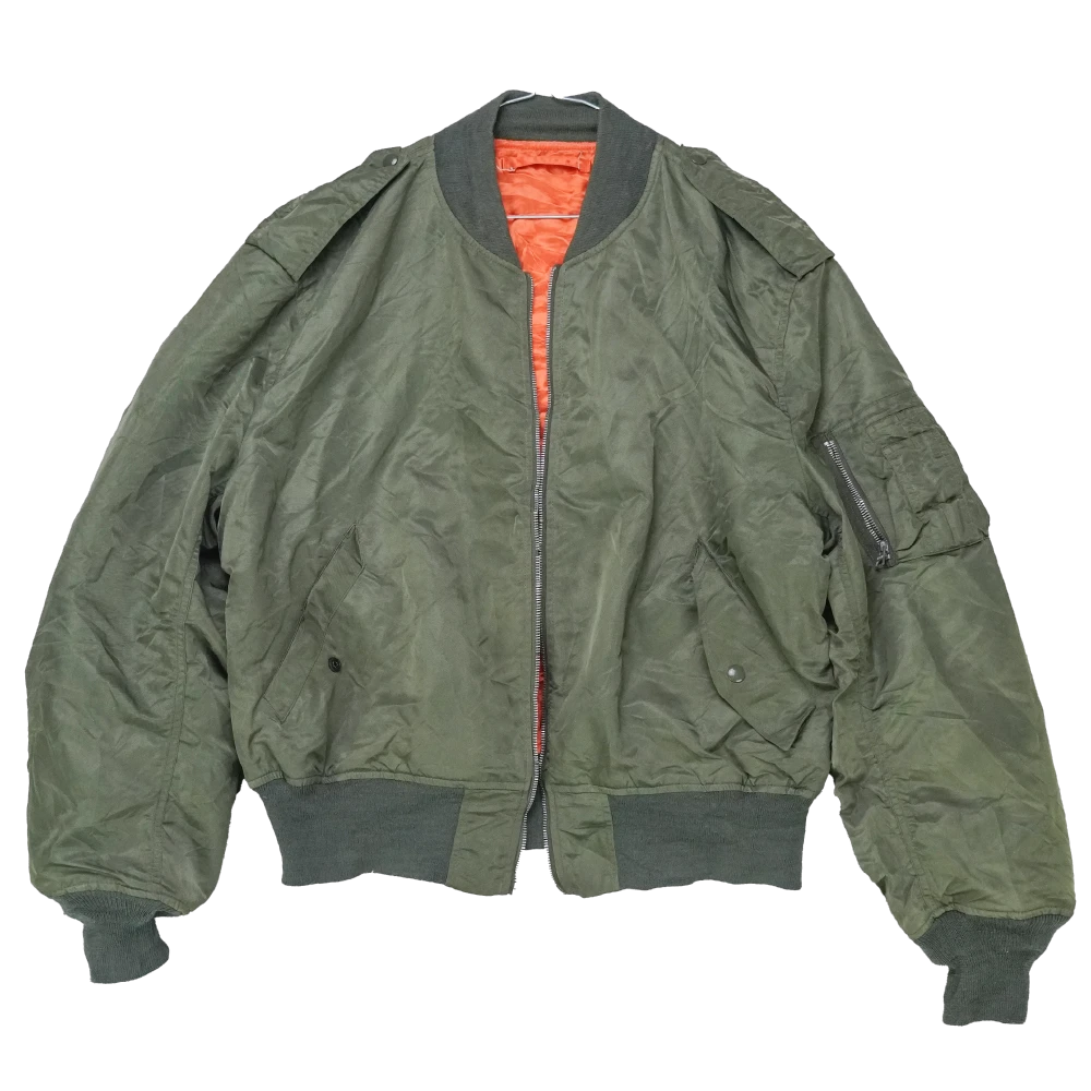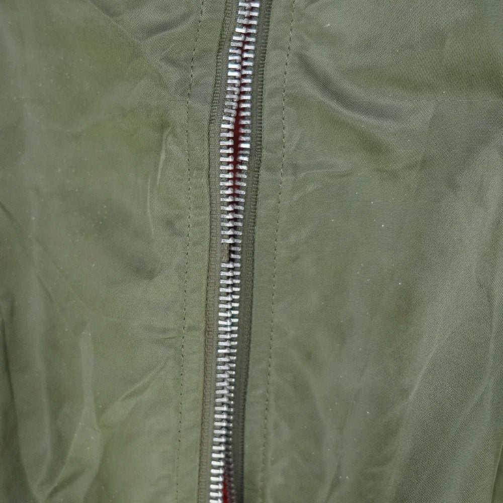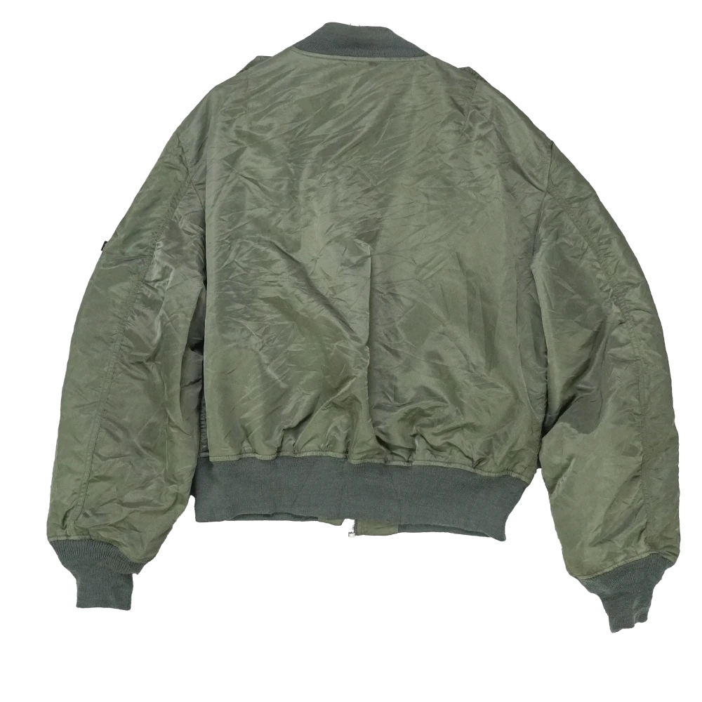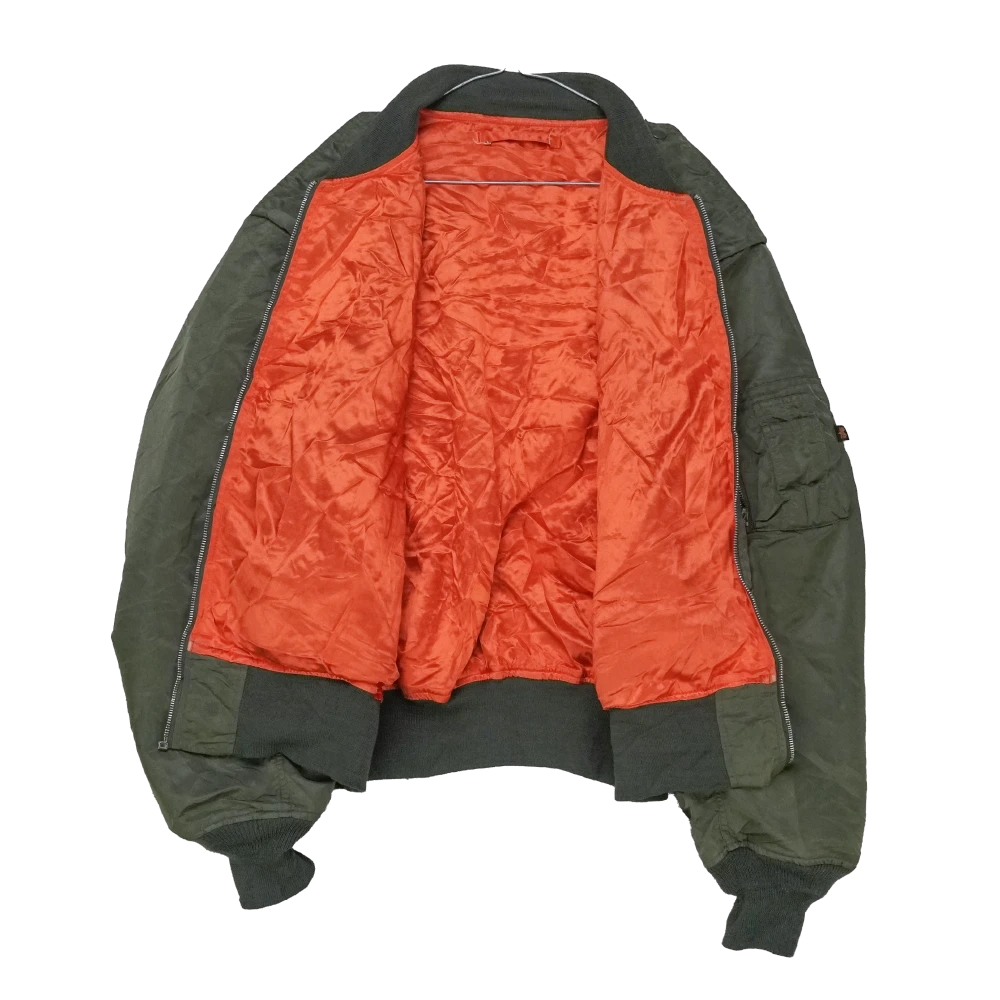 Alpha Industries MA-1 flight jacket in a classic bomber style. Features a fully lined construction with a front zip closure, ribbed collar, cuffs, and hem, along with utility-style pocketing.