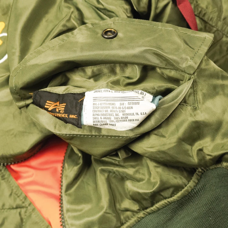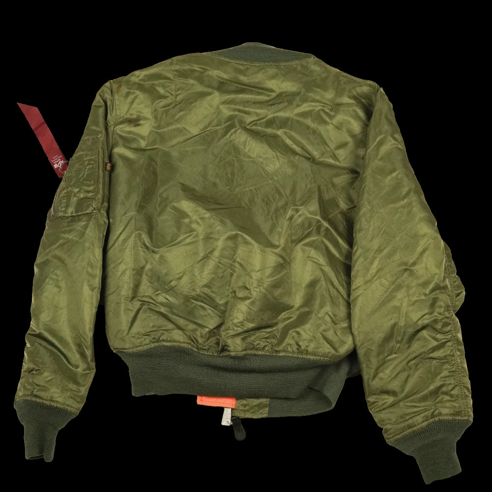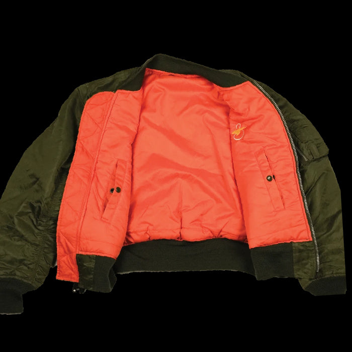 Commercial Alpha Industries MA-1 flight jacket in olive. Nylon and polyester construction with a fully reversible design featuring a high-visibility safety orange reverse. Elasticated collar, cuffs, and waist provide a secure fit, with multiple internal and external storage pockets.