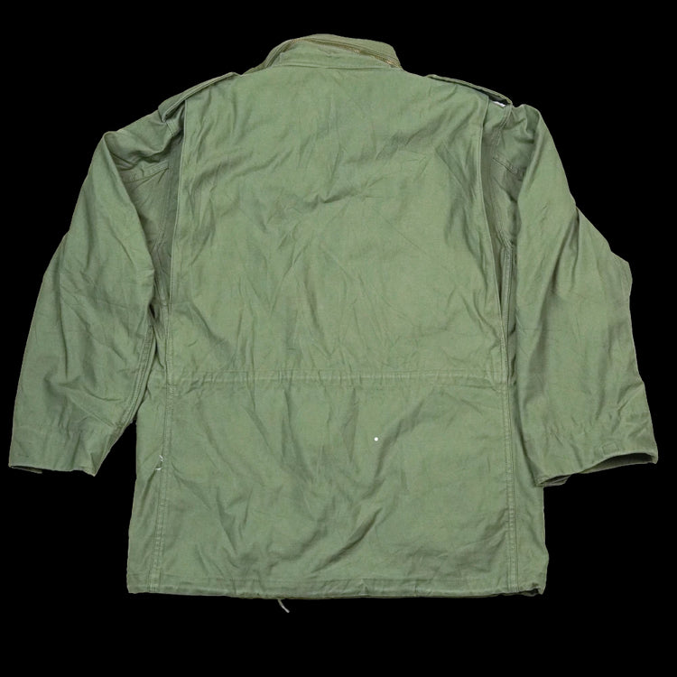 Commercial M-65 style jacket by Alpha Industries in olive drab. Constructed from a cotton/polyester blend and finished with a snap-up storm flap and hook-and-loop neck closure.