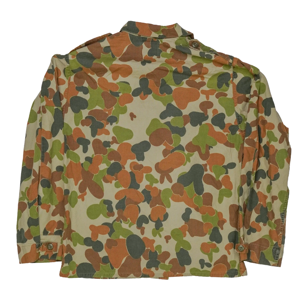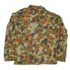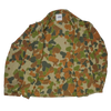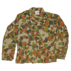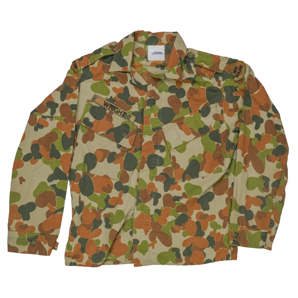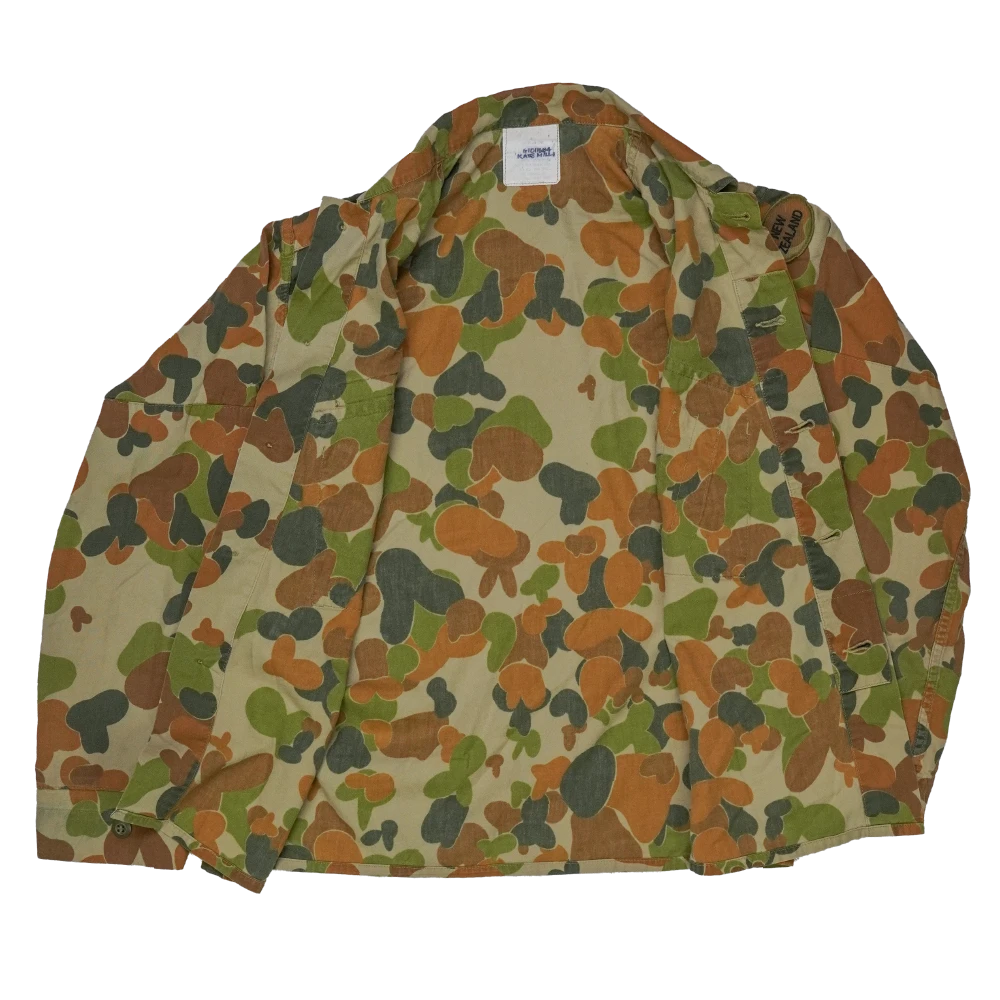 Australian Army DPCU camouflage field shirt with a New Zealand patch attached on the shoulder. The shirt features the distinctive DPCU camouflage pattern and a button front with a pointed collar. Two angled chest pockets with buttoned flaps are present on the front, along with shoulder epaulettes.