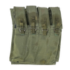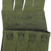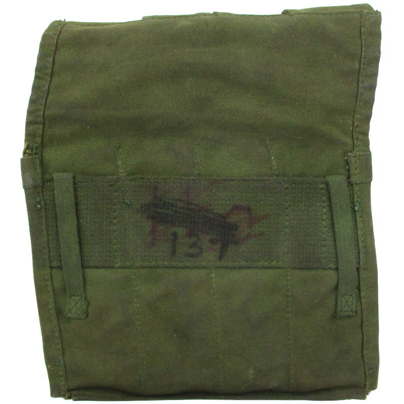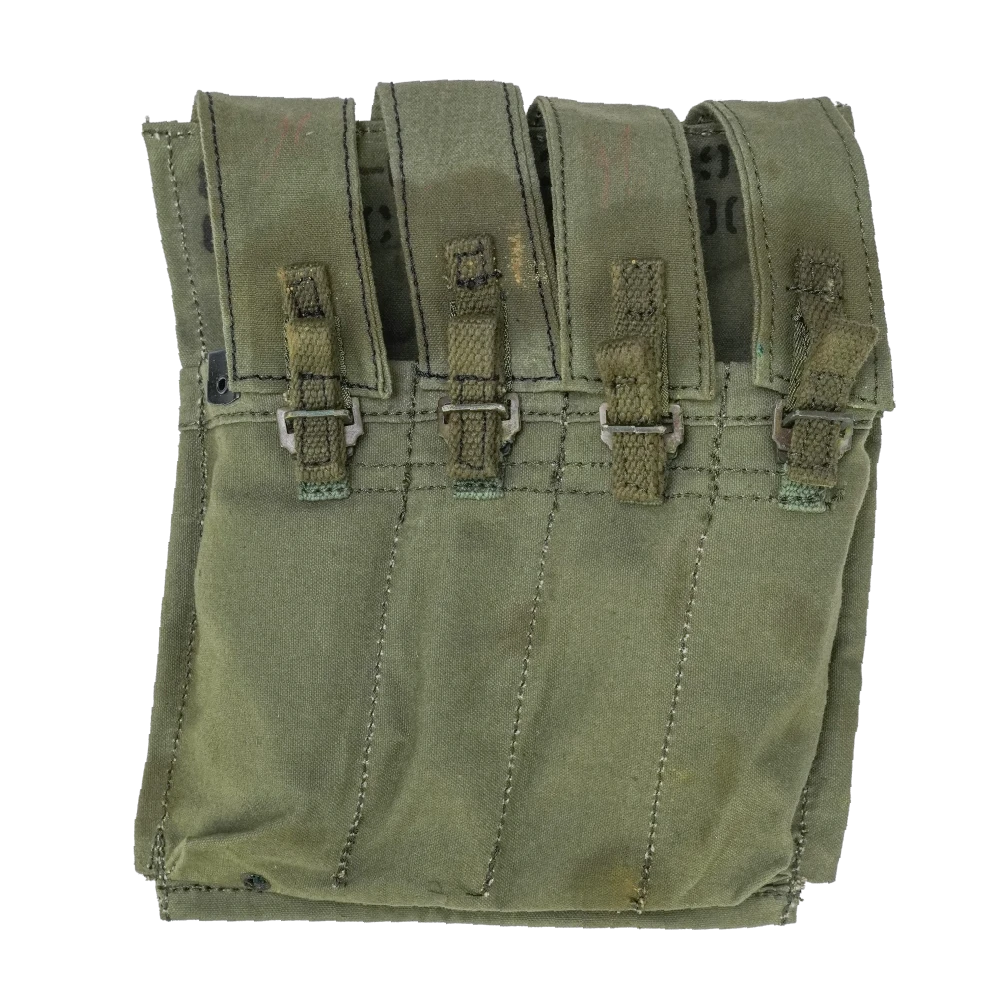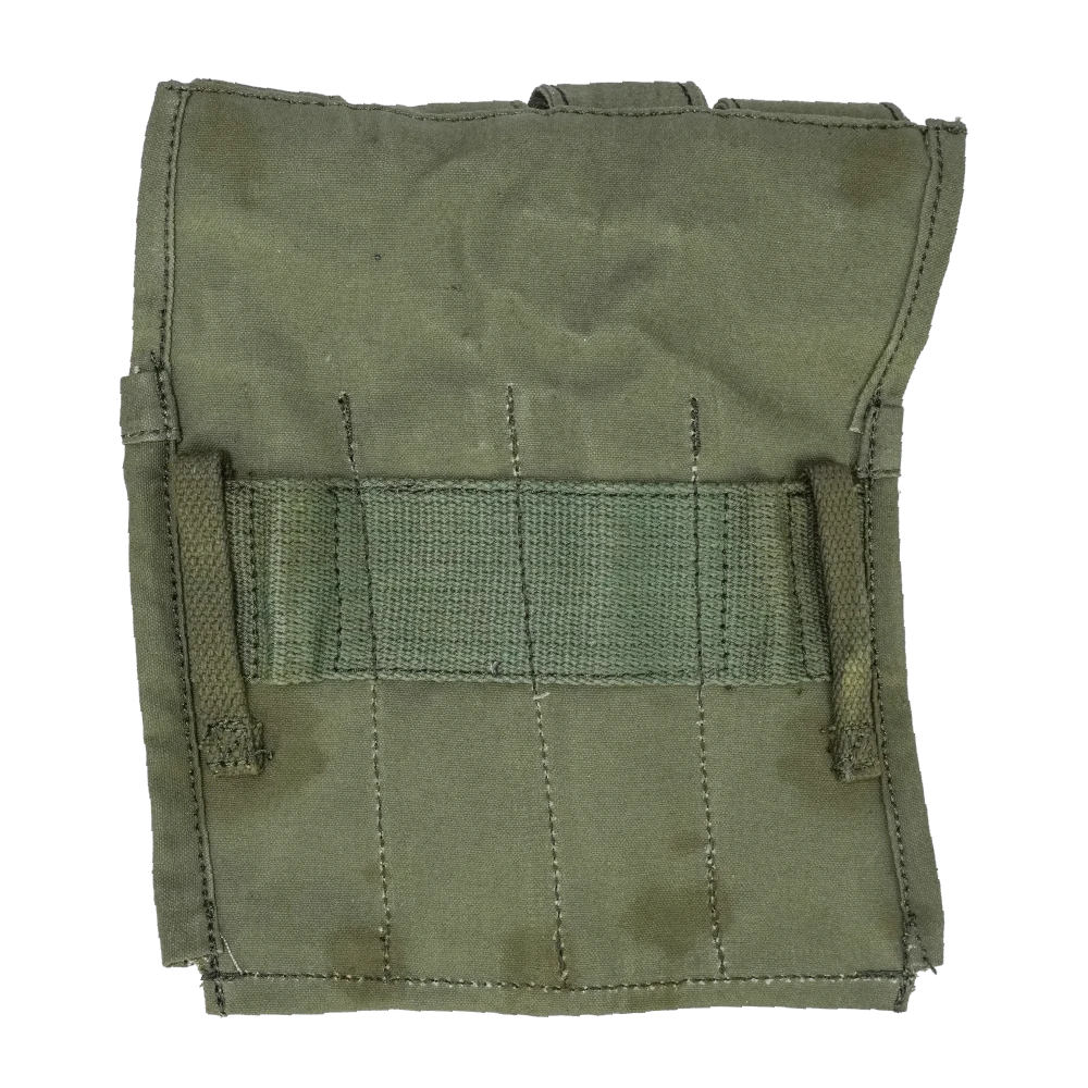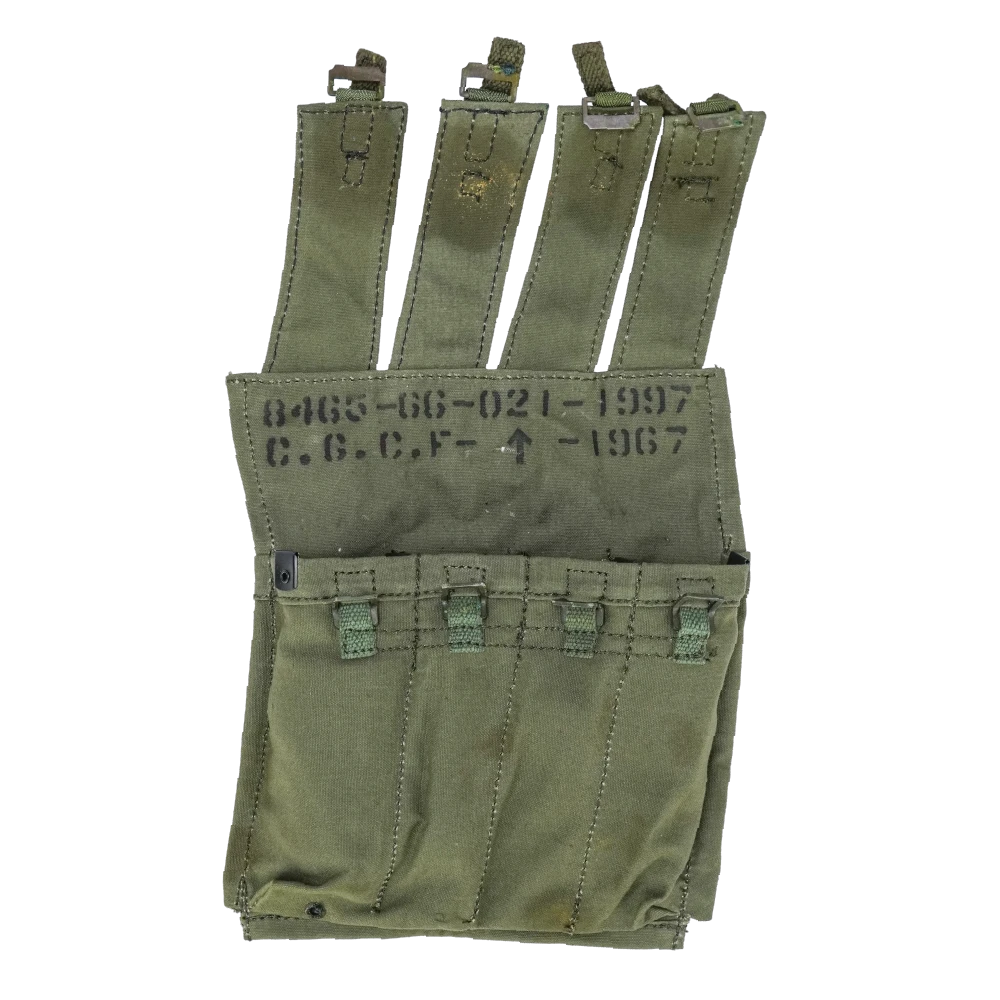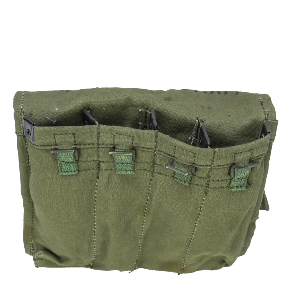 A basic curved four cell design, you can fit a single magazine in each. To access each magazine is a separate flap with quick release pull tab. You can mount these on almost any web belt with dual 6.5cm belt loops on the back. Each cell has a eyelet at the bottom to drain any water when crossing rivers or the likes. Made from extremely durable canvas, these have lasted up to half a century and could easily go another.