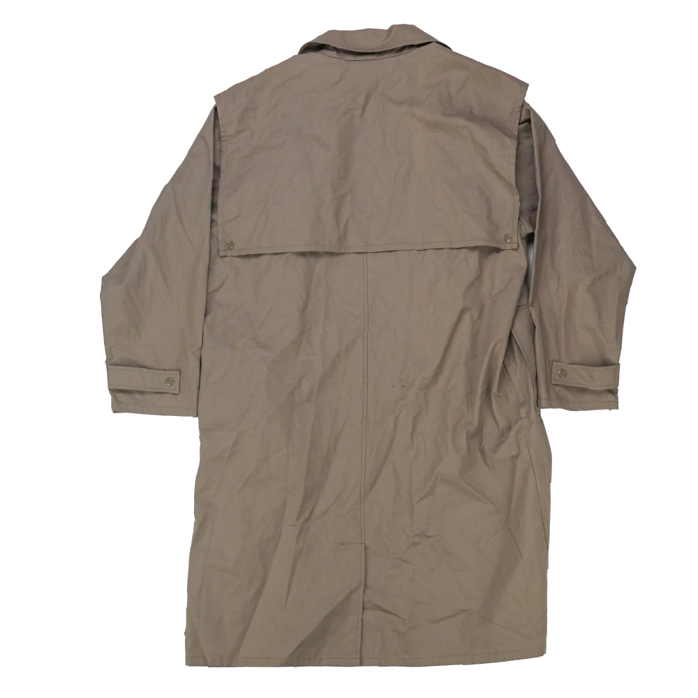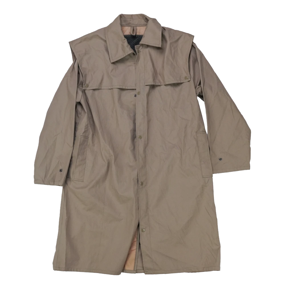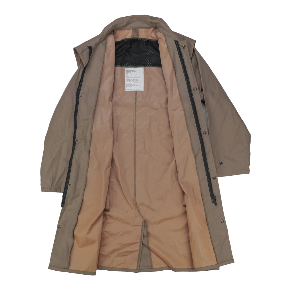 Australian Defence Force Fletcher Jones waterproof coat in tan. It has a long coat cut and plain finish, with a waterproof outer for wet-weather wear.