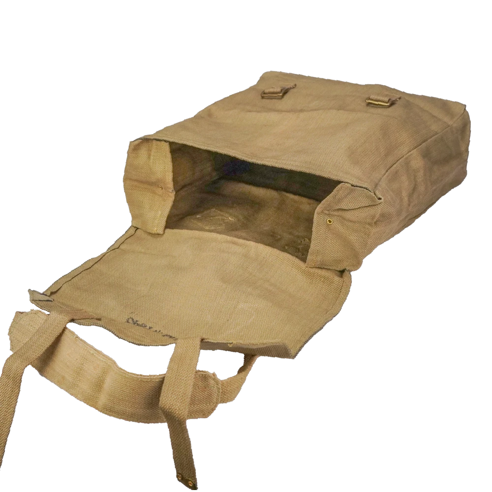 The interior provides a single main compartment with a stiffened back panel and stitched seams for structure. Webbing loops and attachment points are fitted on the rear, along with adjustable shoulder straps. Two colour variants exist in greenish-khaki and yellowish-khaki webbing, picked at random.