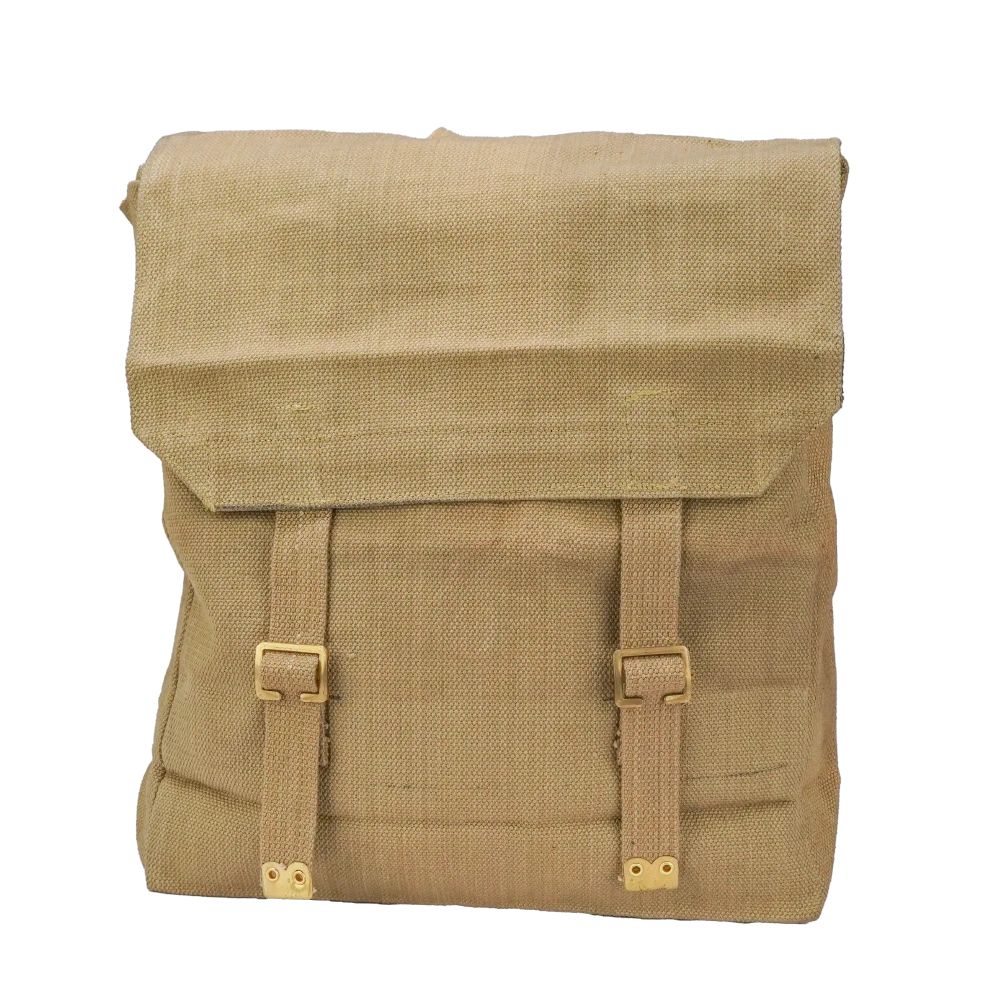 Australian Pattern 1937 (P37) haversack constructed from heavy woven cotton webbing with brass fittings and internal fibreboard stiffening panels to help the bag hold its shape. The design features a large flap closure secured by two adjustable webbing straps with brass buckles, and a reinforced body with stitched panel construction.