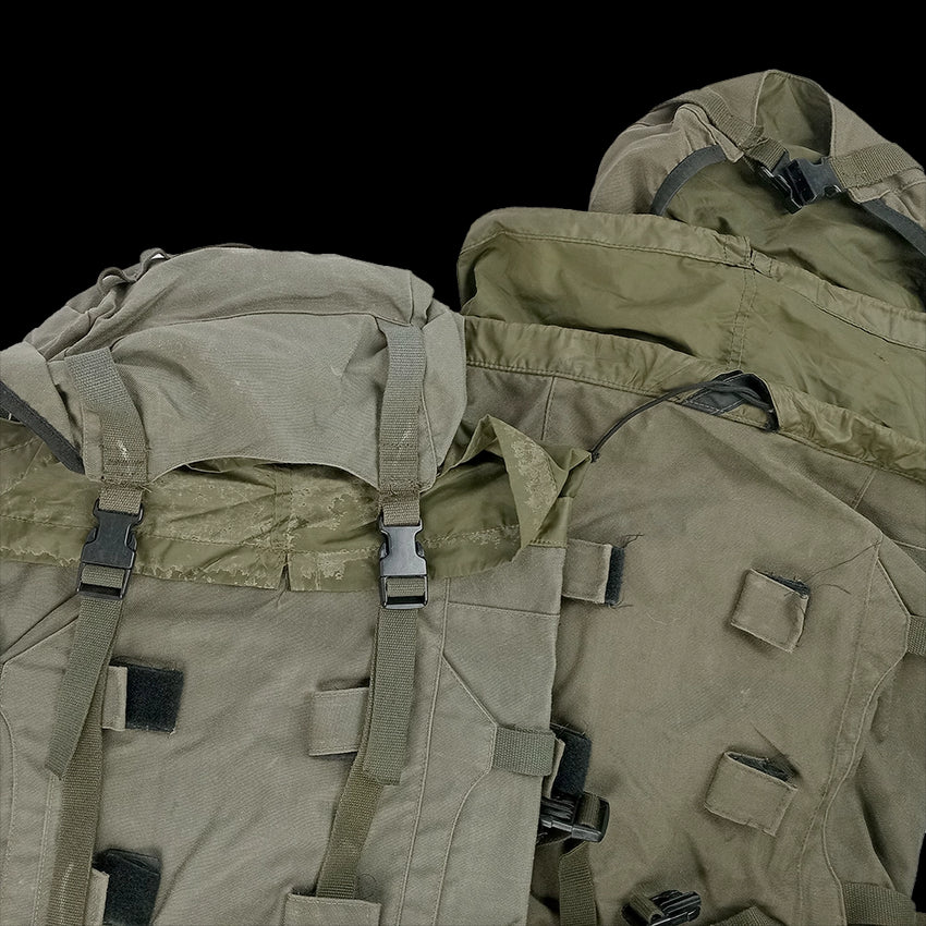 These packs have been worked pretty hard but still have a good life left ahead of them, due to the construction and design. Some may show degrading internal waterproofing, cut straps that appear to have been repaired and the odd small hole.