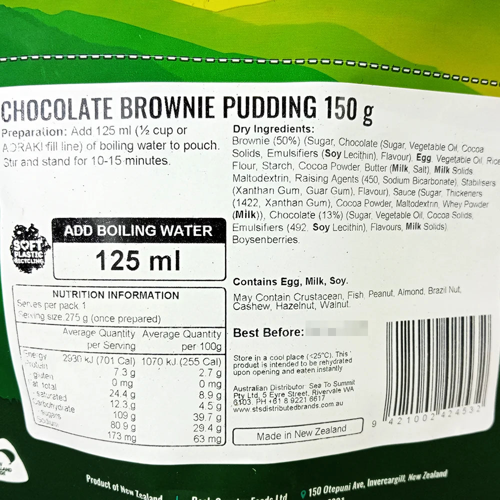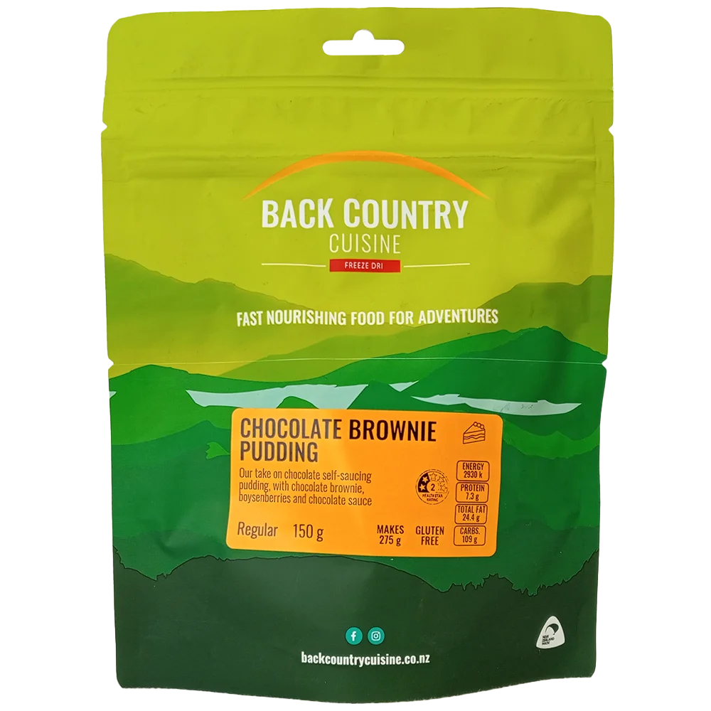 Our Back Country Chocolate Pudding pack contains a chocolate self-saucing pudding with chocolate brownie, boysenberries & chocolate sauce. To use simply tear the bag at the top, remove any sachets, add boiled water and stir. Let stand for 10-15 minutes, stir once more for good measure and your good to eat after a hard slog!