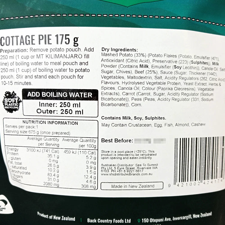 Our Back Country Cottage Pie pack contains a satisfying mix of freeze dried savoury mince and vegetables with a potato topping. To use simply tear the bag at the top, remove any sachets, add boiled water and stir. Let stand for 10-15 minutes, stir once more for good measure and your good to eat after a hard slog!