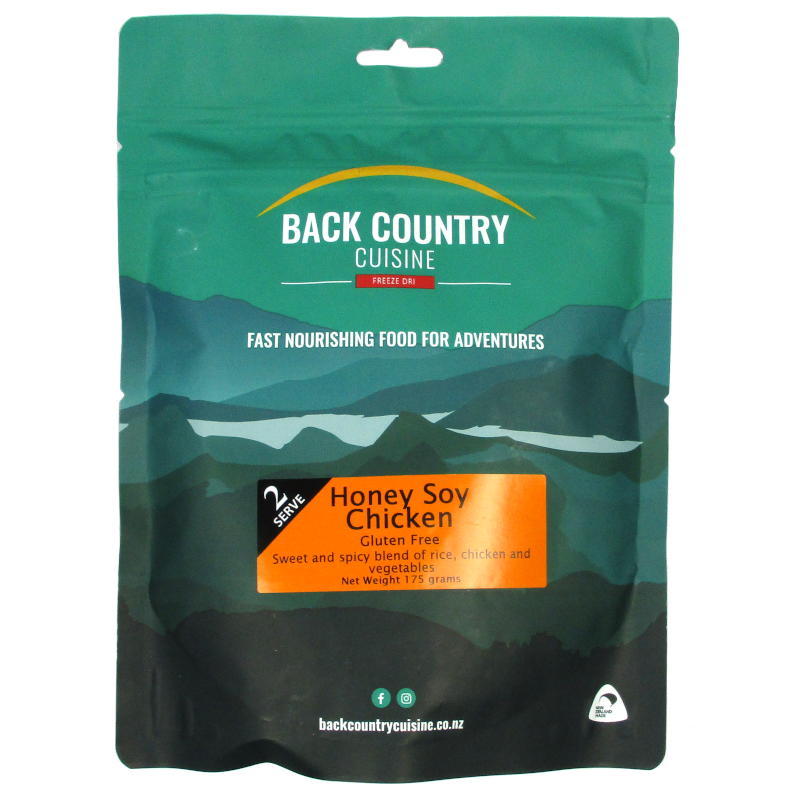 Our Back Country Cuisine Honey Soy Chicken pack contains chicken and vegetables with a spicy blend of rice. To use simply tear the bag at the top, remove any sachets, add boiled water and stir. Let stand for 10-15 minutes, stir once more for good measure and your good to eat after a hard slog!
