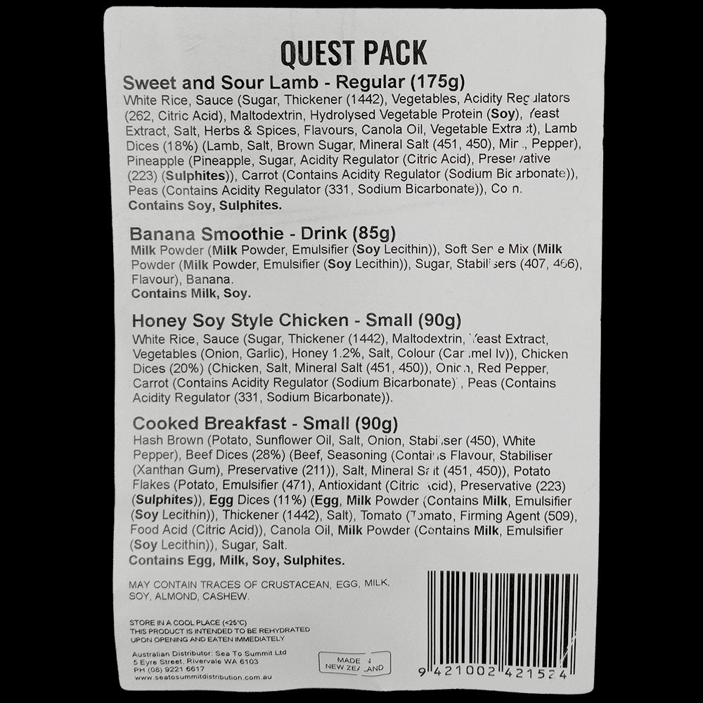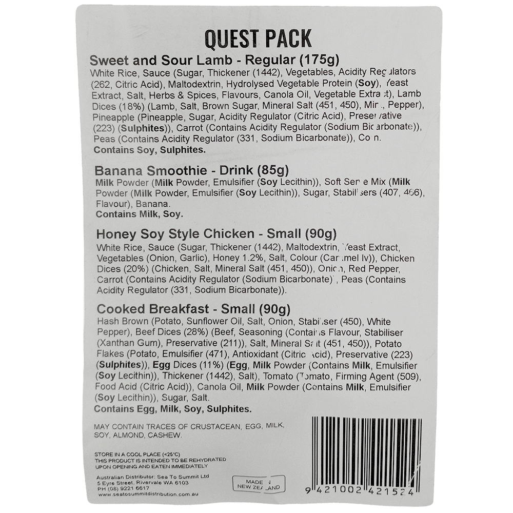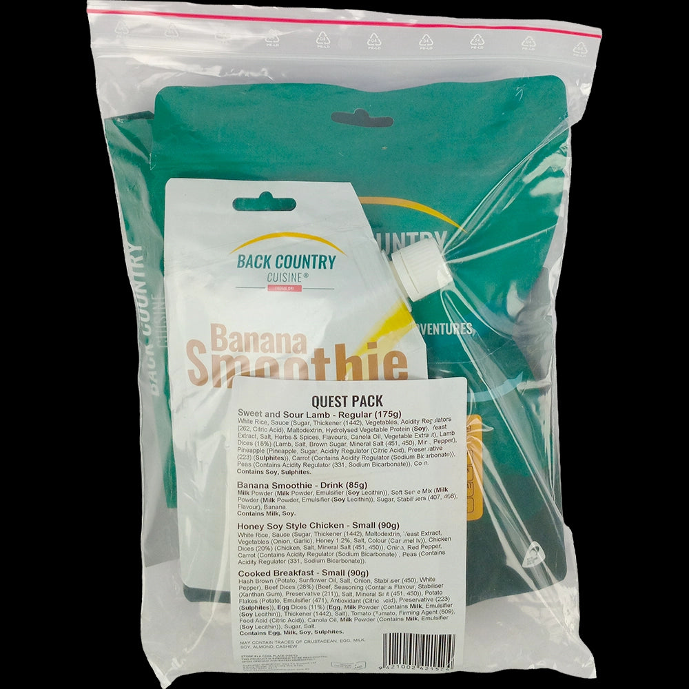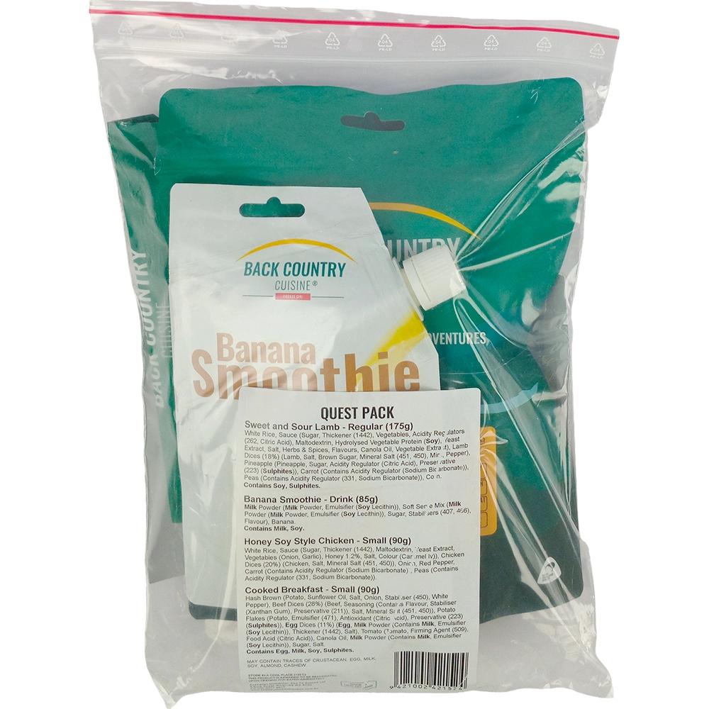 Each pack is your all-in-one solution for breakfast, lunch, dinner, and a smoothie. Compact, lightweight and ready when you are. Kick off your morning with a hearty 90g Cooked Breakfast, then choose between a 175g Sweet & Sour Lamb or a 90g Honey Soy Style Chicken to keep you going through lunch and dinner. When you need a quick pick-me-up, a Banana Smoothie delivers instant energy on the move.