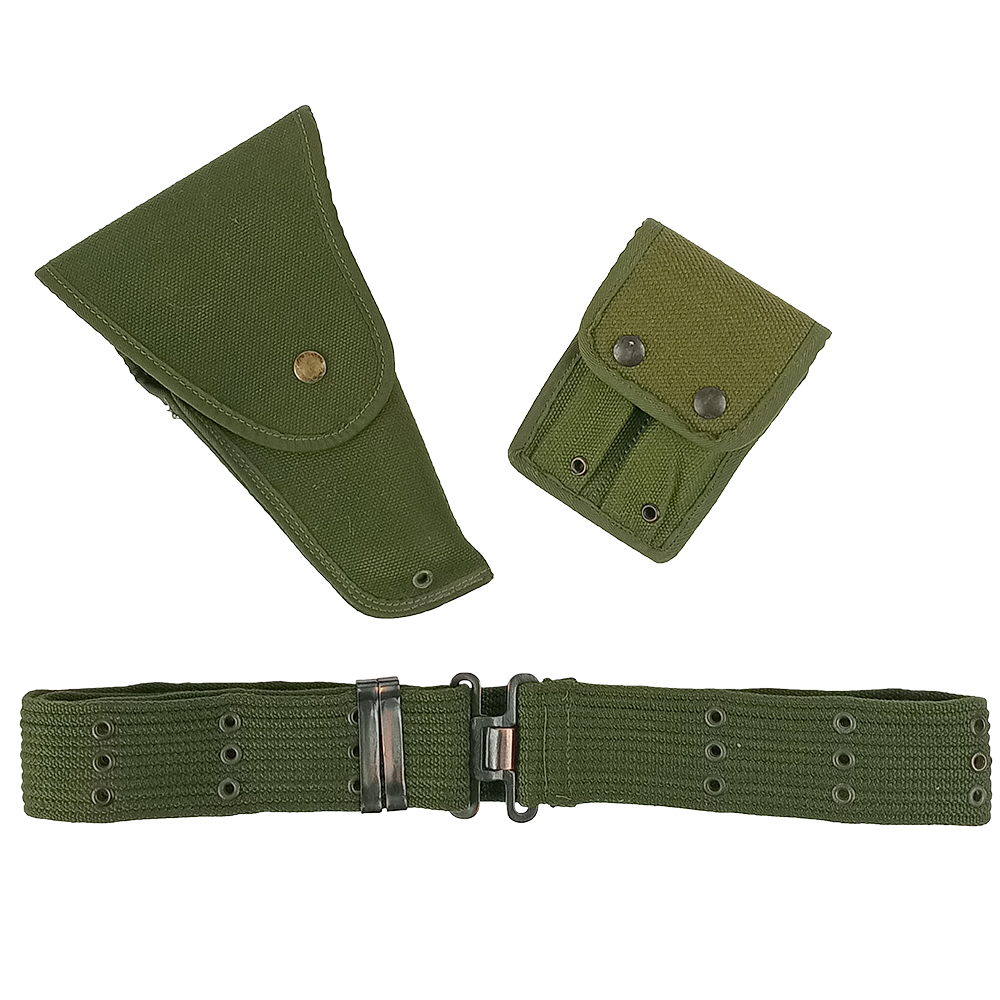 These were used from around 1975 until 2000. In classic olive drab, they are made from sturdy canvas weave and make quite a tidy matching set. The holster is made for the Browning Hi-Power, no surprise as Belgium is the home of infamous Fabrique Nationale (FN). A 2 cell magazine pouch will keep you topped up and the belt is adjustable. Many of these have storage wear, like scuffs, corrosion to the hardware or dust, but otherwise look great for a bit of old kit!