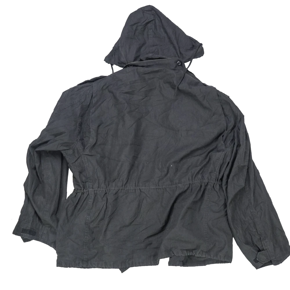 A plain black finish gives it a clean military-inspired look. This is a commercial jacket in used/good condition.