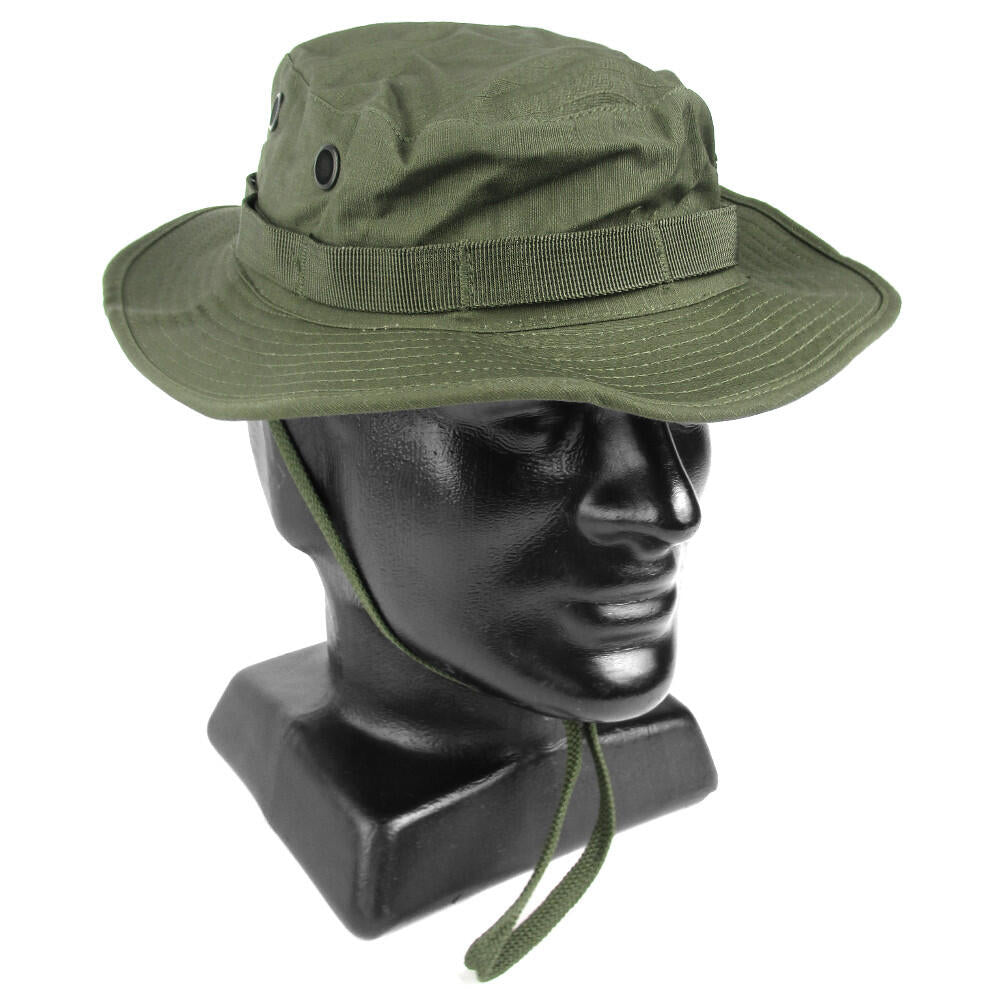 The boonie hat was originally designed for U.S. troops in Vietnam, and these hats are authentic replicas of the genuine issue. They provide great eye protection from driving rain or the harsh sun. They feature screened grommet holes for comfortable ventilation and an adjustable chin strap to keep the hat firmly on.