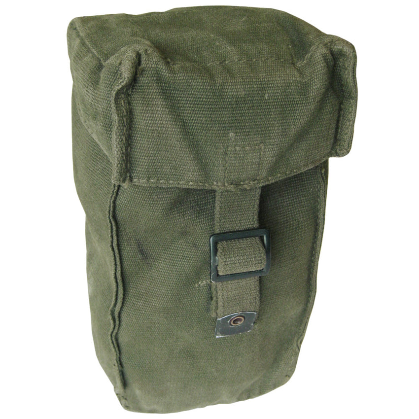 This British army water bottle pouch is part of the 58 pattern harness system. The harness system consists of a yoke, web belt, pack, two mag pouches and this canteen pouch. C-Clips on the back of this water bottle cover allow it to attach to web belts, much like th 3 hole Belgian web belt.