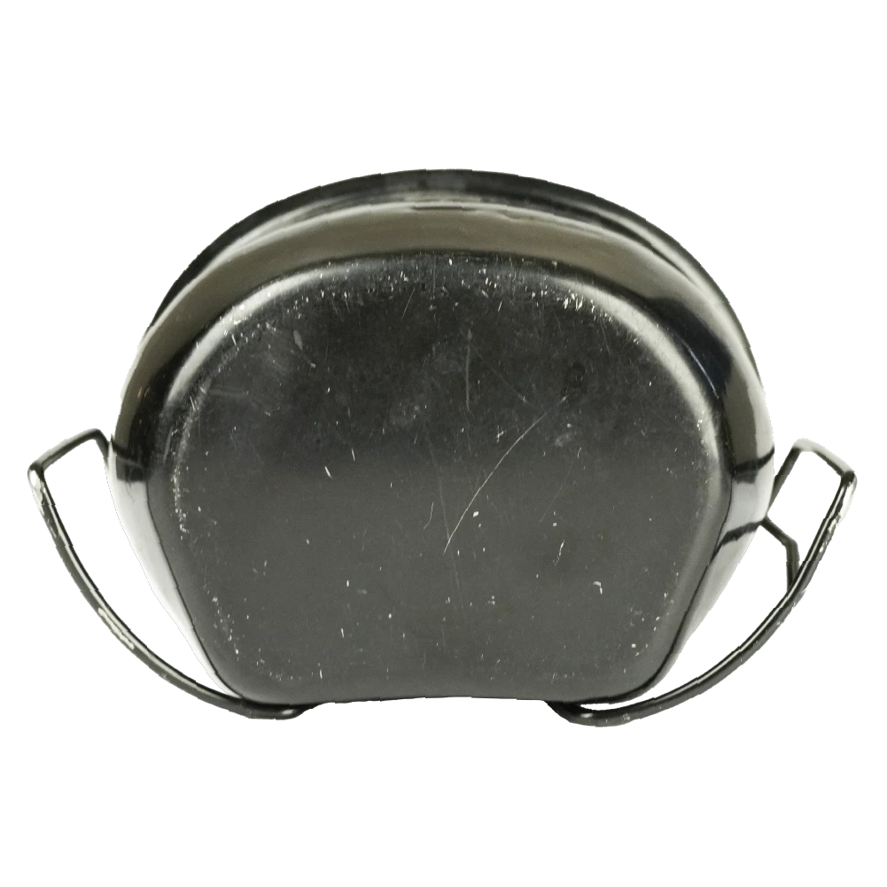 British Army steel canteen cup in used condition. The cup features a blackened exterior with a bare steel interior and is designed to fit around a standard issue canteen.