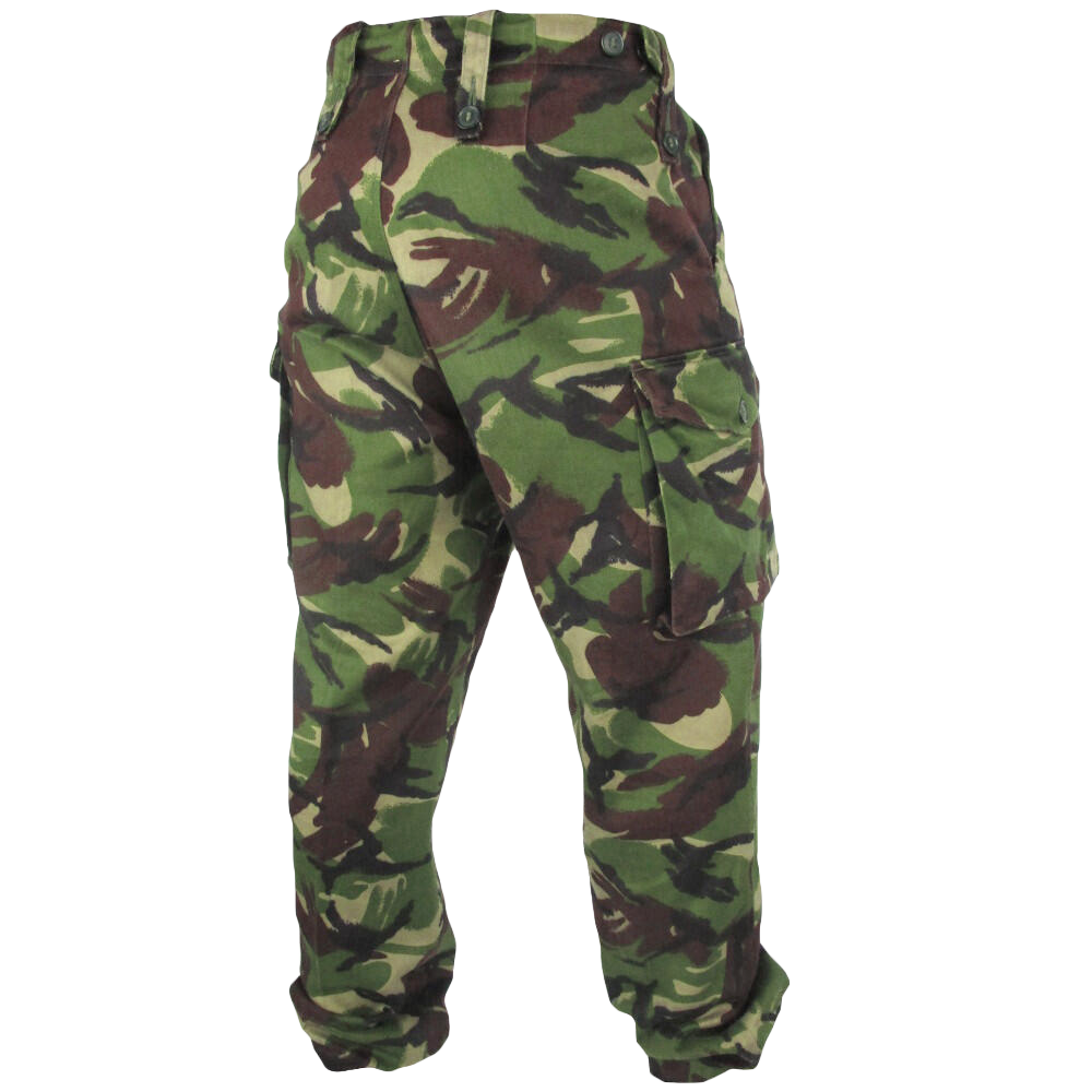 British Army 1980's issue DPM combat trousers. In this batch are a mix of styles, from temperate to tropical, and this means there will be some colour and material variations. With good capacity for carrying gear in the field, cargo and hip pockets can be stocked up with your favourite cuppa tea and monarch memorabilia. Plenty of waist adjustment going on for times when the full English breakfast goes too hard, these have waist adjustment tabs and a front draw cord.