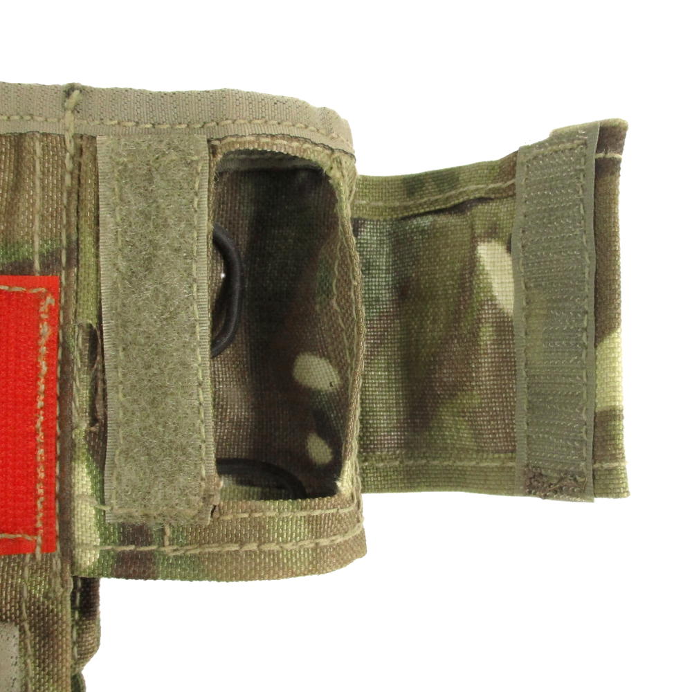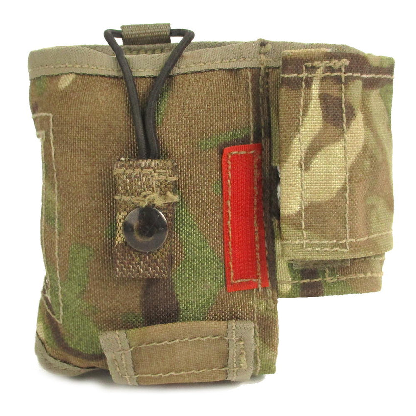 This is the current issue British Army pouch used to carry the Personal Role Radio (PRR) - the standard communication system for infantry soldiers. A side compartment fits the locator beacon which connects to the radio through the bottom of the pouch. This side compartment features a hook & loop flap for covering the controls and protecting them from dirt. An elasticated snap dome secures the radio from the top. MOLLE attachment loops on the rear allow this pouch to be securely attached to a vest. British soldiers would most likely attach this to their Mk IV Osprey combat vest.