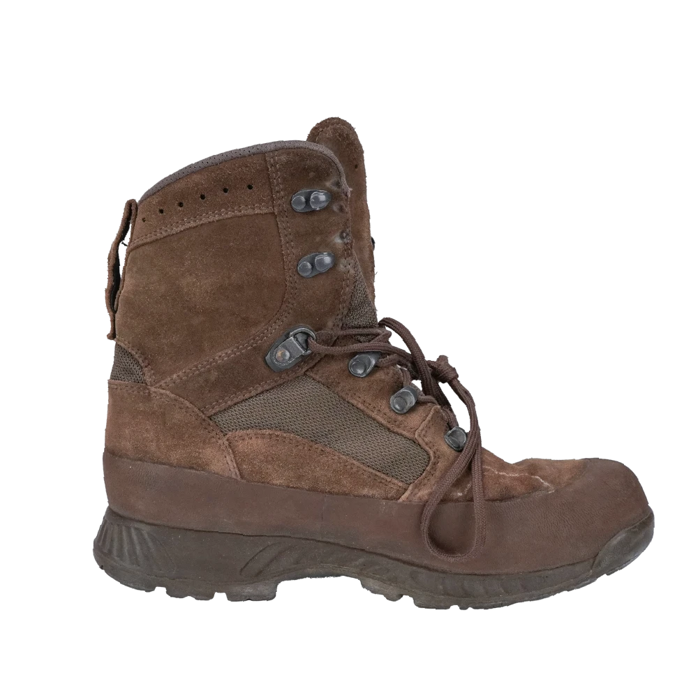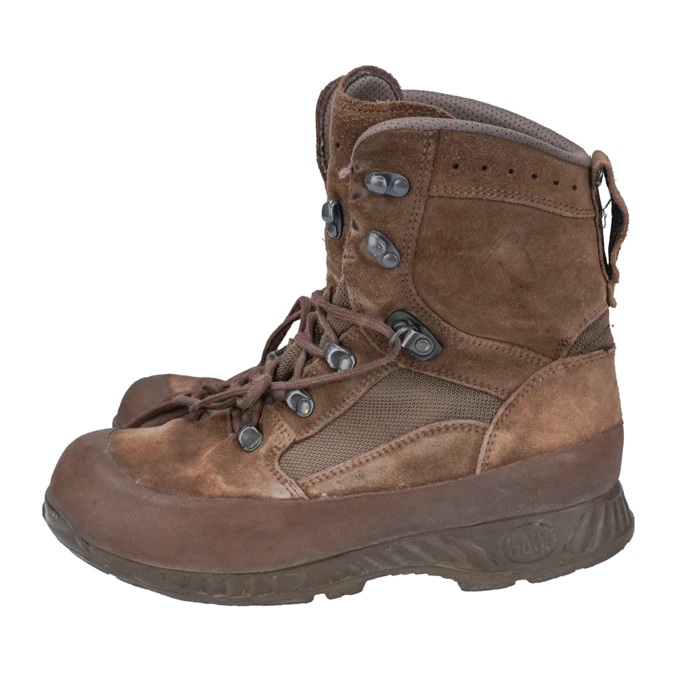 British Army Haix Desert Scout boots in UK size 8 Wide. Desert tan leather and fabric upper with lace-up front and padded collar.