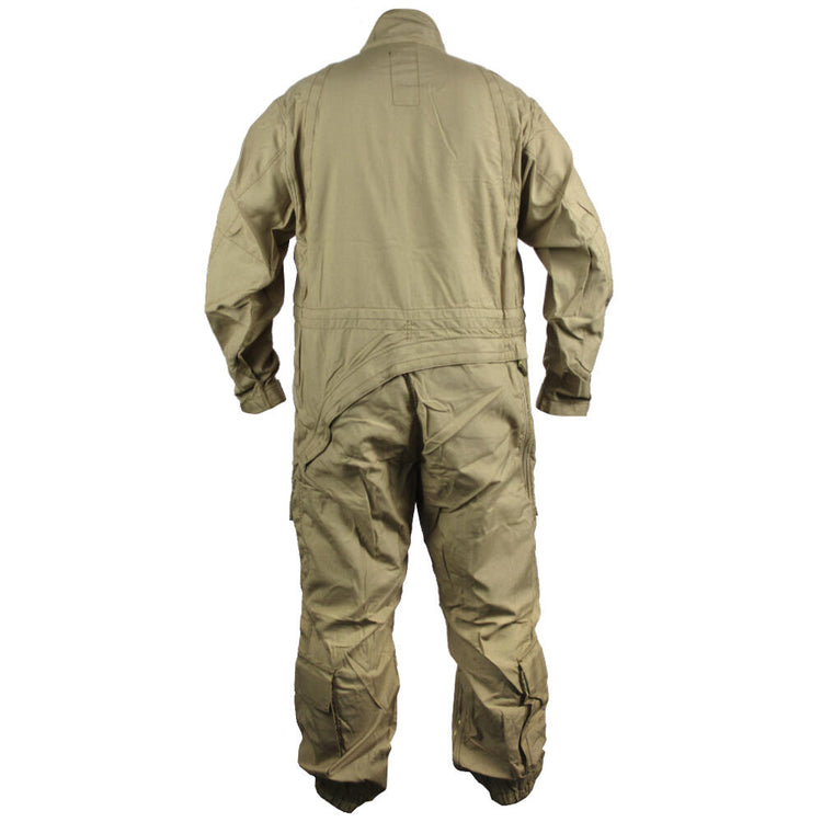 These beige overalls are issued to British army pilots. Filled with features and details that makes them both comfortable and handy. The resistant material is the perfect protection for pilots working conditions. Thigh mounted ID windows allow pilots to keep identification visible at all times. Cargo pockets provide space for extra gear and equipment. In "emergency situations", a back flap can be opened for the user's relief.