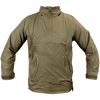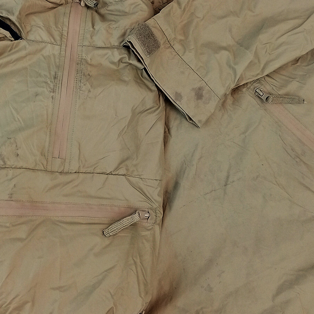 This fellow is a fleece lined, anorak style mid layer. These are close fitting but could be worn with a thin base layer (such as a thermal top) underneath. These are so close fitting - especially around the chest/armpits - we recommend to size up for comfort (or aesthetic). These ''smocks'' have wind sealed zips all over (quite a few!) and aid in temperature regulation and function. The two slanted pockets are access points for one kangaroo style pocket (great for warming hands) and the mid-chest pocket adds more storage. Zips to the underarms and torso sides let in some fresh air if you are a bit too toasty. The whole interior is lined with fleece and the exterior is a thin ripstop nylon. A small emergency hood is stowable in the neck. Hook & loop adjustable waist and cuffs + a draw cord to the neck seal you up for extra toastiness.