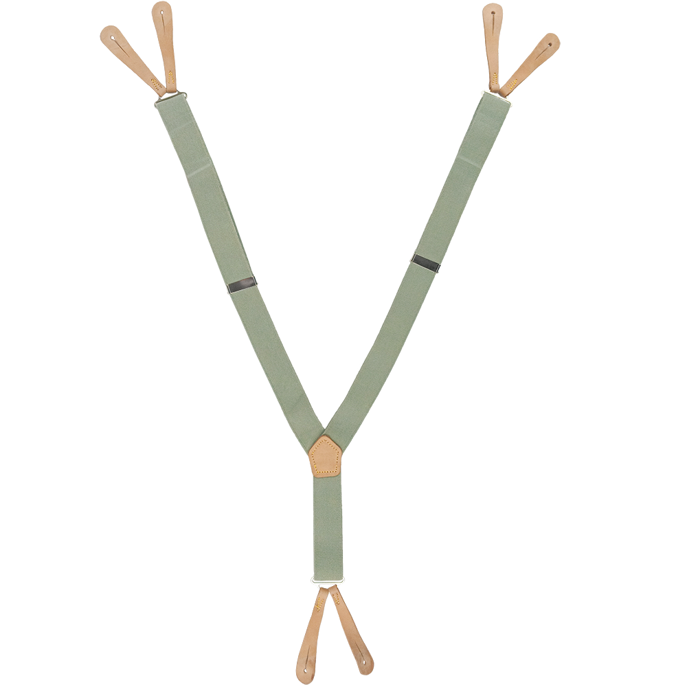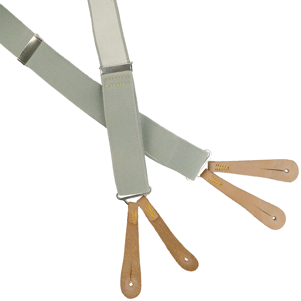 In grey-blue, these British Forces braces (or suspenders) require six attachment buttons on the trousers you want to hold up. The adjustable and elastic Y-shape design has durable, soft leather attachment points and silver toned hardware.