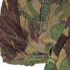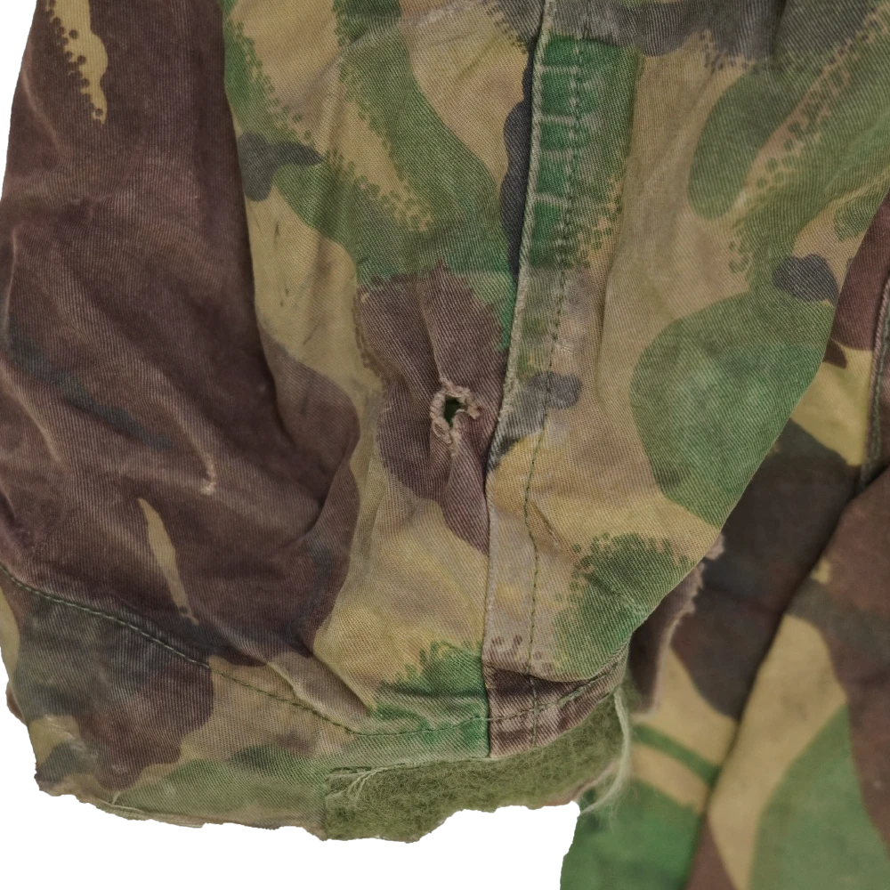 This example is in used/fair condition with frayed cuffs, holes on a pocket and sleeve, a broken pocket button, and a faded label.