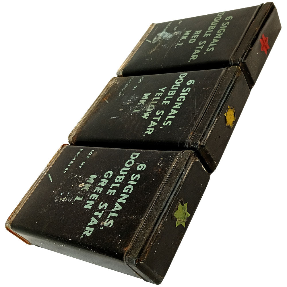 A commonly looked over aspect of warfare is communication. The allies became masters of communicating with advanced technologies however even much more utilitarian tools had their uses - flares. The Brits & commonwealth were issued these tins that used to contain a set of 6 flares. Each box would have a coloured star at the top to tell the user which colour they would be lighting up. They also have different markings according to colour imprinted on them so you can feel at night which colour you are handling (cross for red, circle for yellow, triangle for green). Originally these would be somewhat water tight, although with age and use this is probably not fully the case for all of them.