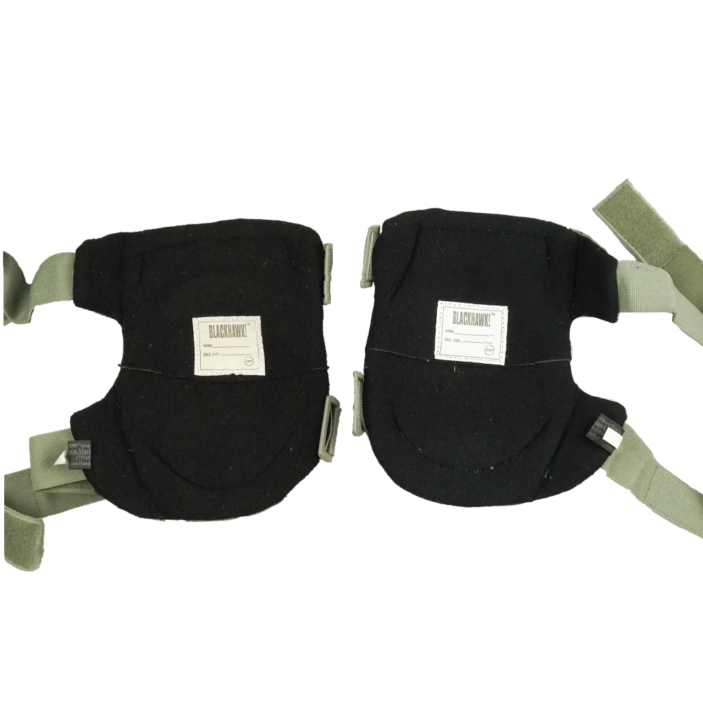 British issue Blackhawk V2 knee pads in olive colour. This is a matched pair of hard-shell knee pads with internal padding and adjustable elastic retention straps.