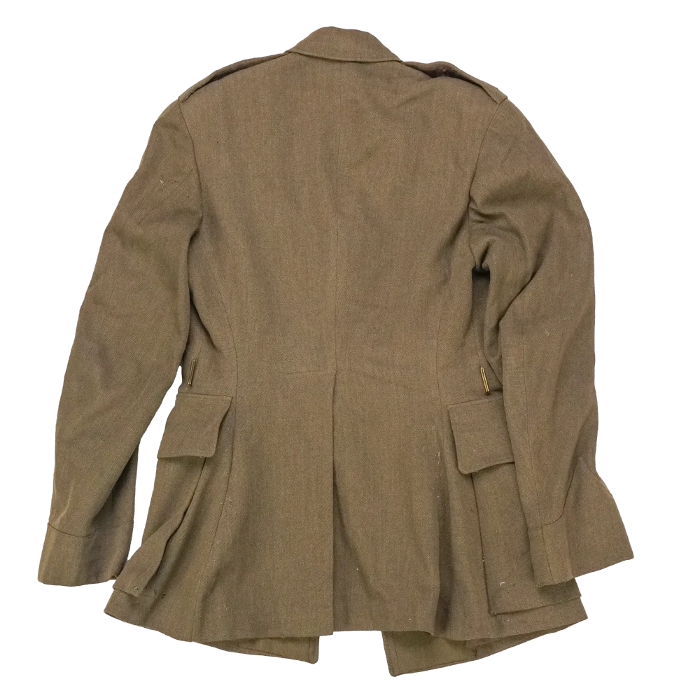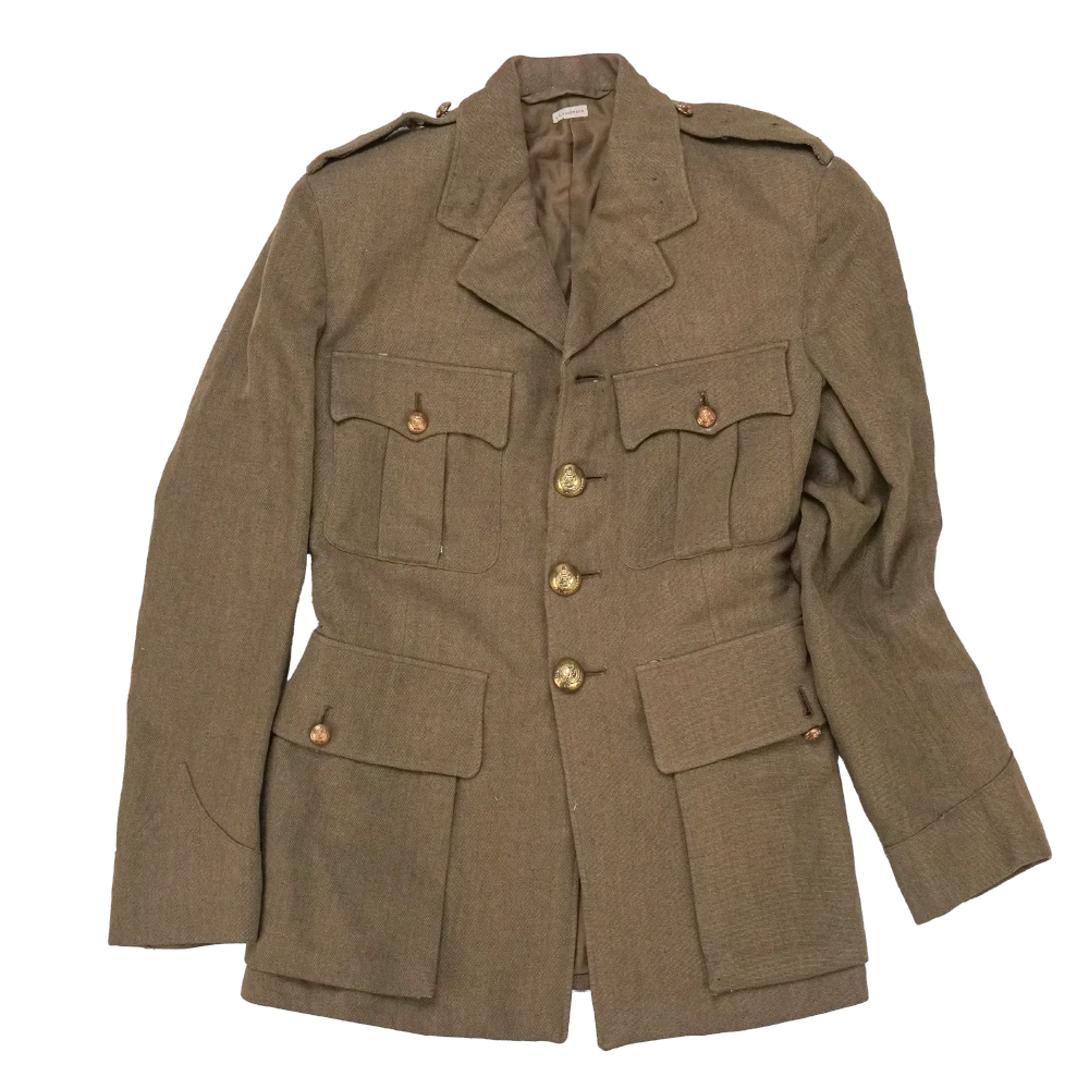 British Royal Engineers wool service dress jacket in a medium size. It has a structured dress uniform cut with a front button closure, notched lapels, and hip pockets.