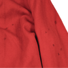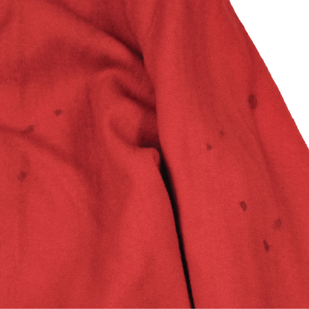 Condition issues are present, including multiple stains and holes on the left sleeve, and missing shoulder buttons.