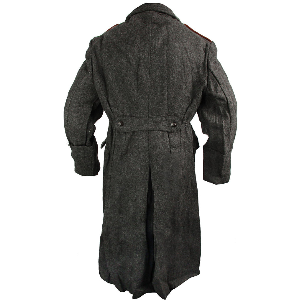 Issued during the Cold War era in Bulgaria as a full length overcoat that extends down past the knees and keeps you warm with a high wool content in the fabric. The front flap secures with six buttons, starting just below the collar and finishing at the waist. Additional details like the red trim on the epaulettes and collar make this piece stand out against other military coats. The cuffs are rolled back and stitched in place. Give yourself to the darkside and let the coat wrap you in its embrace.