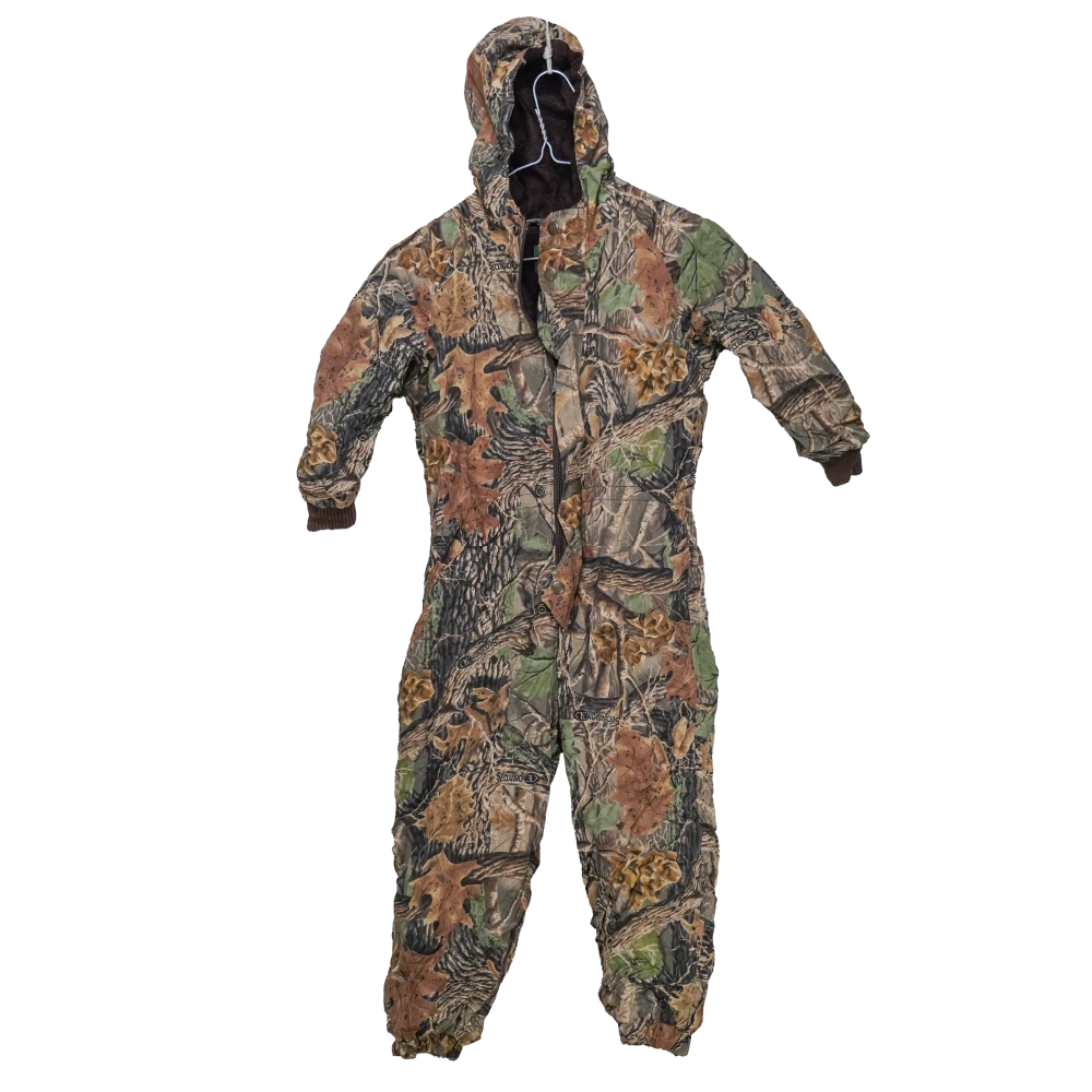Cabela's Seclusion camouflage coveralls with an attached hood. This one-piece garment features a lined construction and full-body coverall design in a camo pattern.