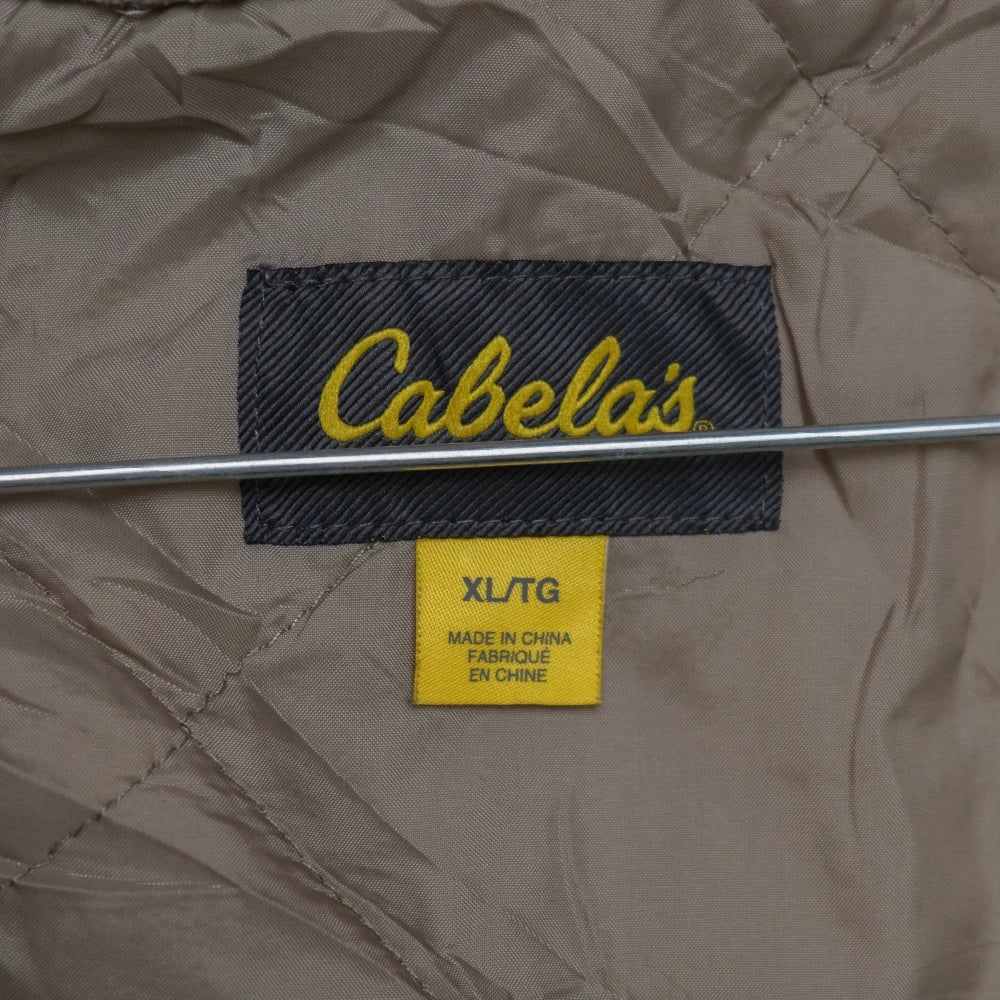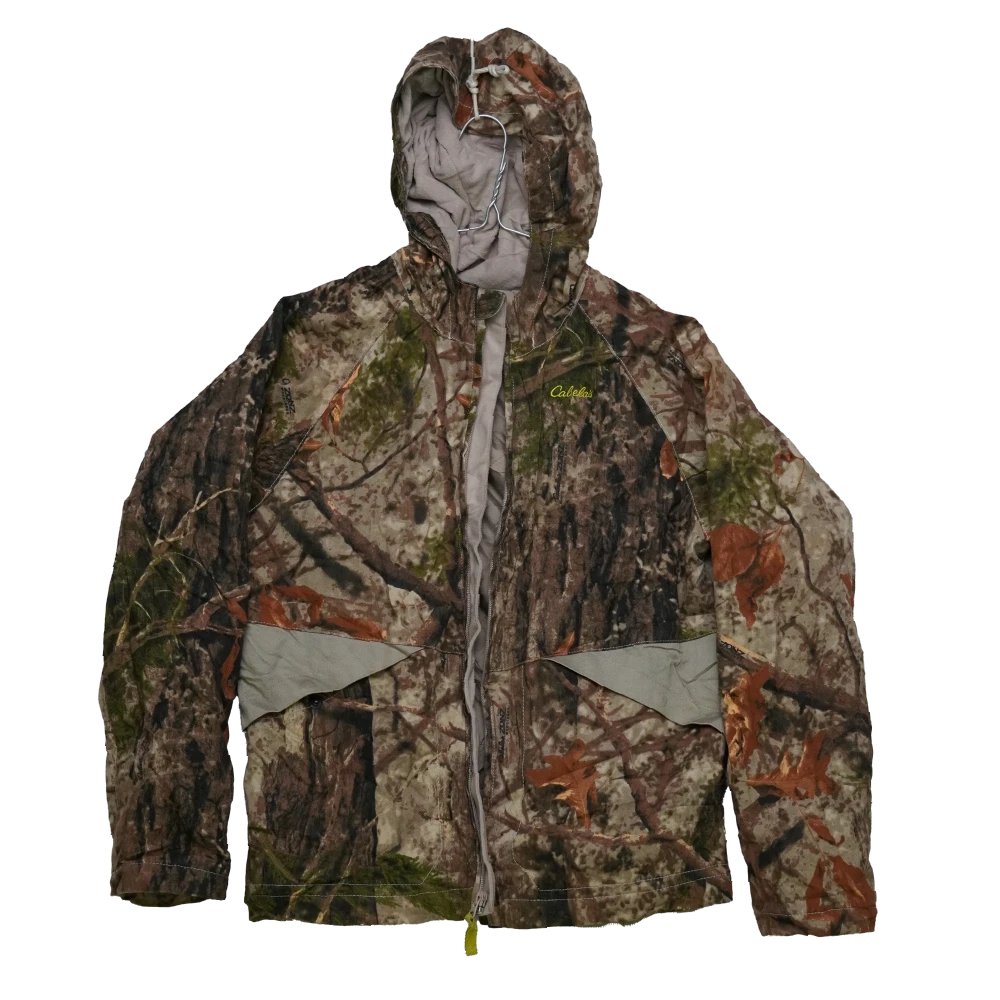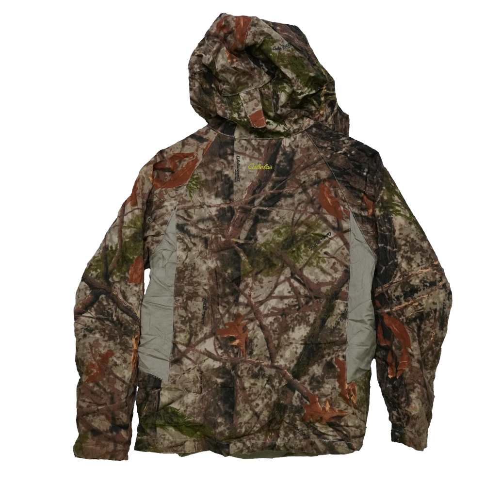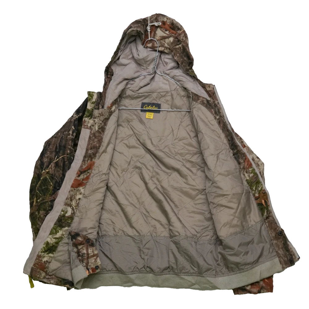 Cabelas Zonz Camo lined jacket with hood. Features a camouflage outer and full lining, with an attached hood for additional coverage.