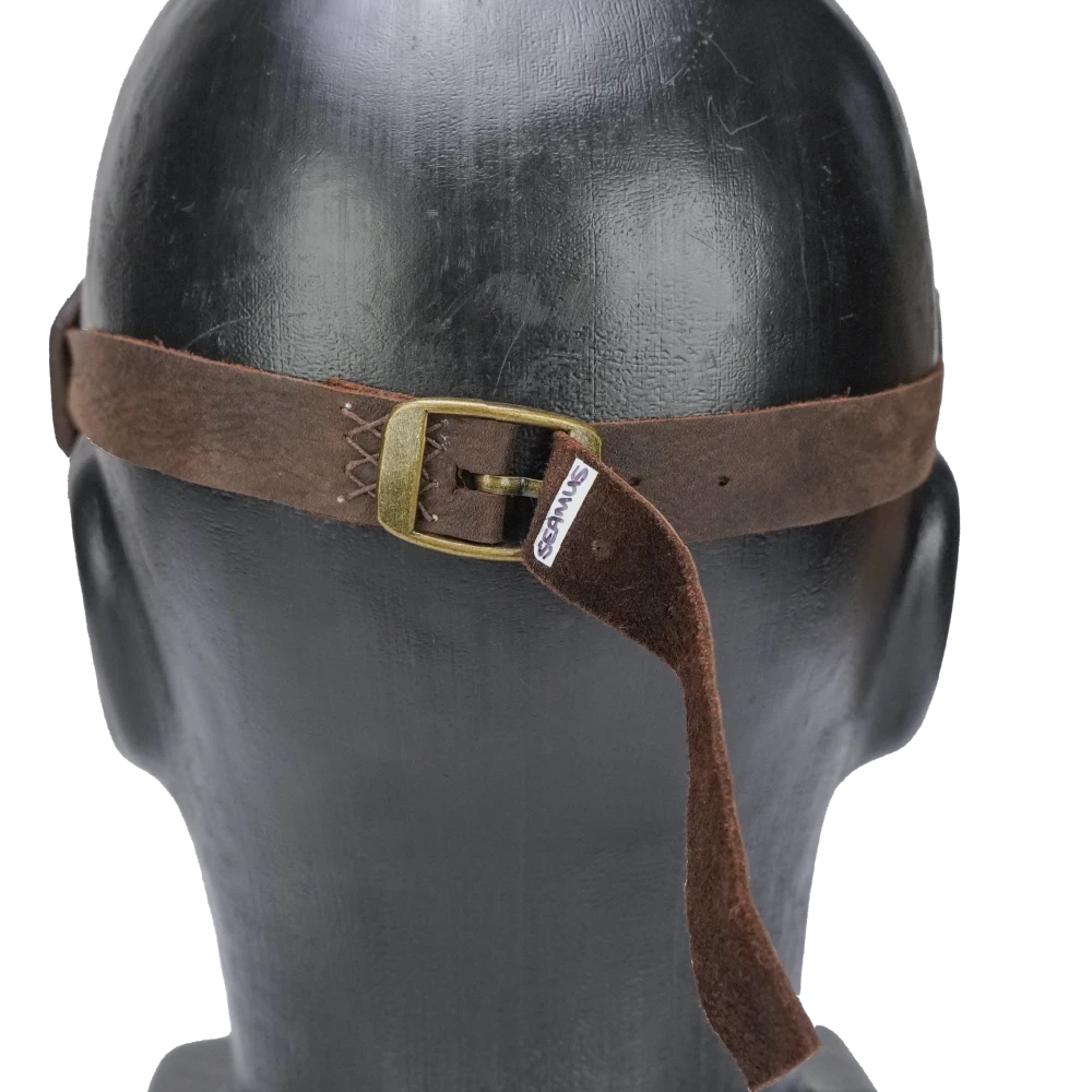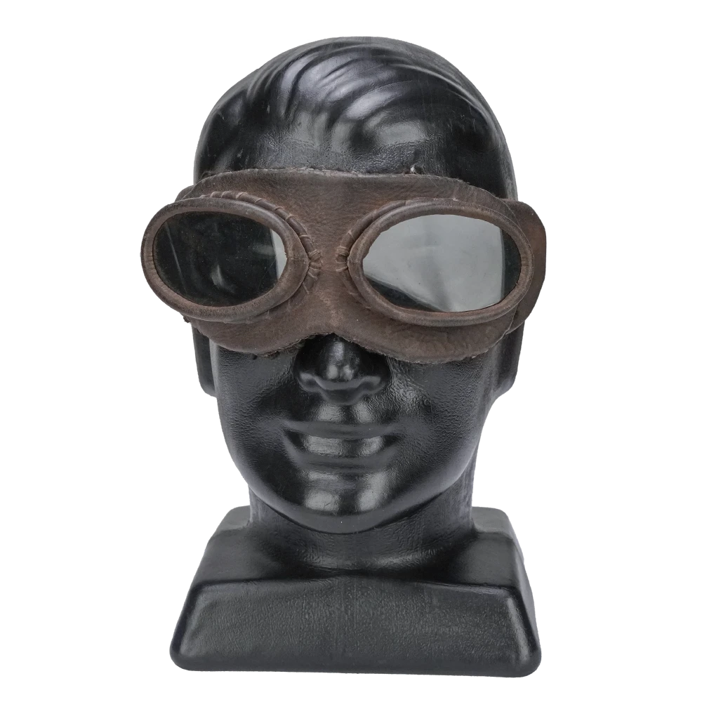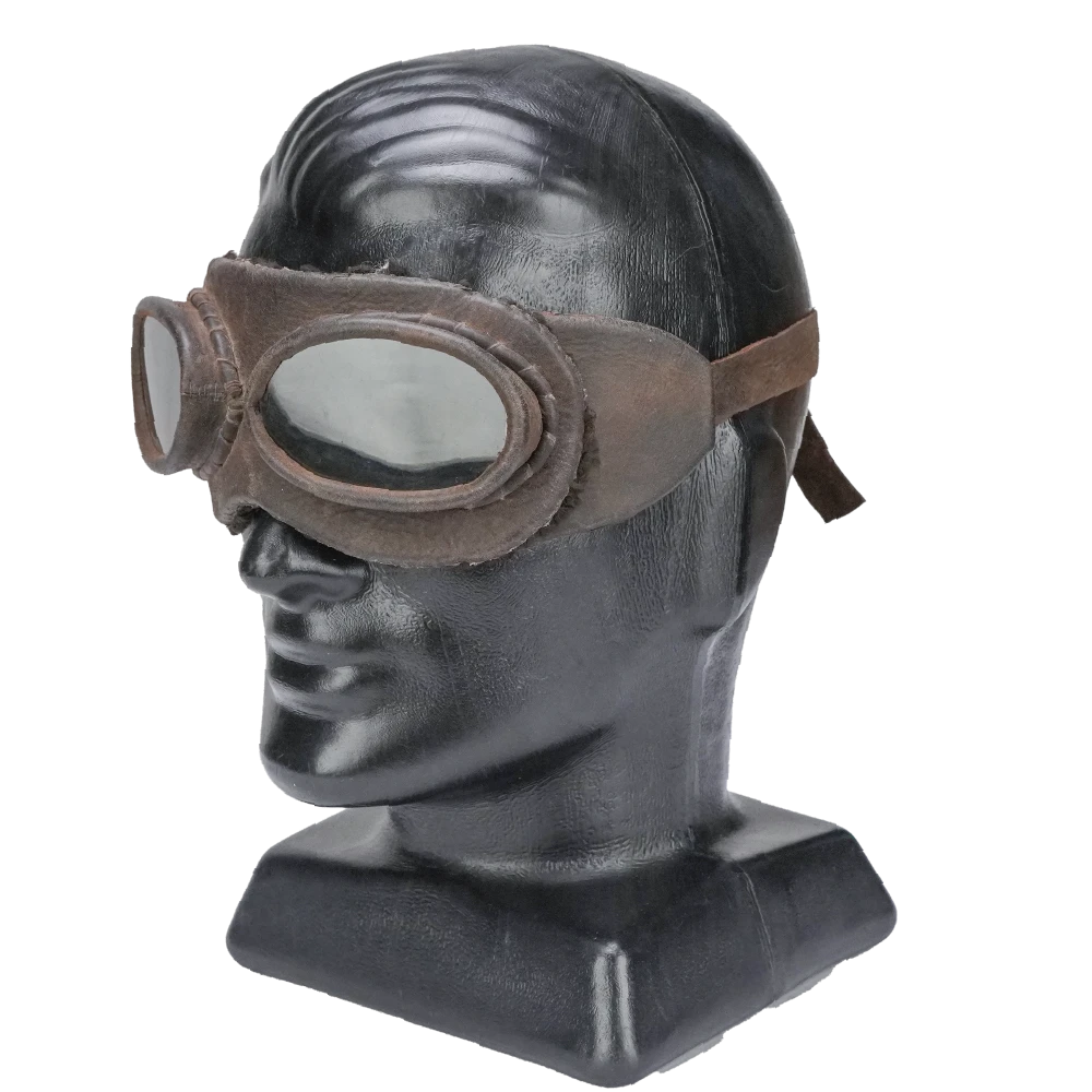 Custom leather aviator goggles with a classic twin-lens design and adjustable head strap. This piece is from ex-film production stock and has been modified, meaning it may no longer function for its original intended purpose.
