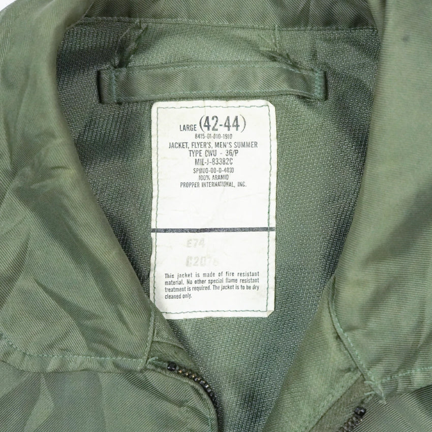 The CWU-36/P Men’s Summer Flyer’s Jacket is a lightweight flight jacket produced for warm-weather conditions. It features a zip front closure, angled chest pockets, and knit cuffs, and is constructed from aromatic polyamide fabric designed to be fire resistant. Manufacture date is 2000.