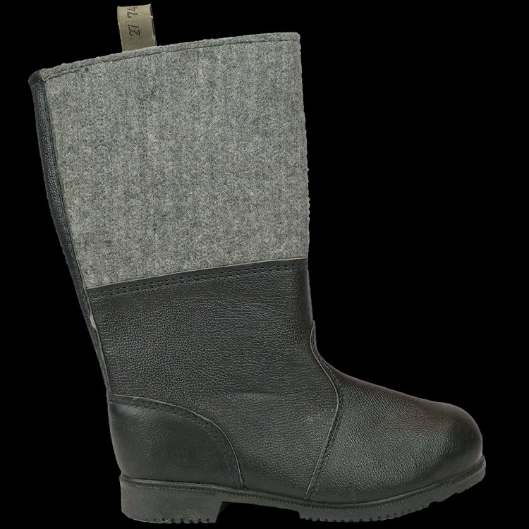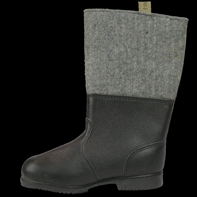 These East German Cold Weather Boots feature a grey wool blend felt top paired with durable leather lower. Designed to keep the East German NVA warm in cold climates, they offer authentic vintage appeal.