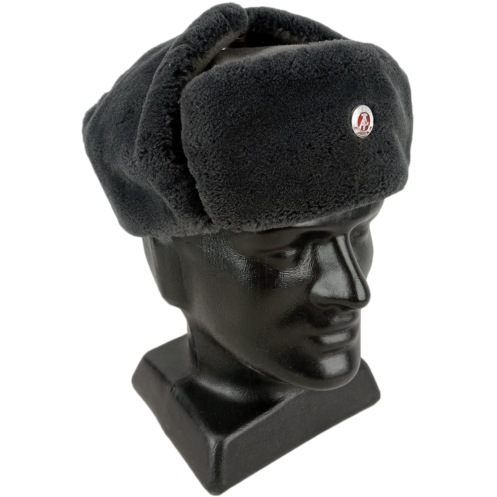 Genuine East German (German Democratic Republic) Army issue ushanka. The war was cold and so was the winter air. Troops would wear these warm ushankas to protect their head, ears, and chin from the cold. The faux fur (or fish fur) ear flaps can be buttoned under the chin or tied back, ski-style. These remained as part of the winter German Police uniform after the reunification of Germany.
