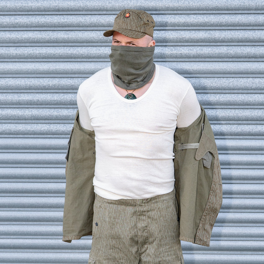 Show off your chest hair to your fellow comrades with one of these East German undershirts! Back when men didn't need layers but did need deep plunges - these undershirts have a large neck opening that sits very loosely around the chest (unless your bricked like Schwarzenegger!). The whole shirt has a huge amount of stretch especially in the chest which we have measured accordingly to be somewhat form fitting. The sleeves have the most elastic retention while the waist elasticity is very loose.