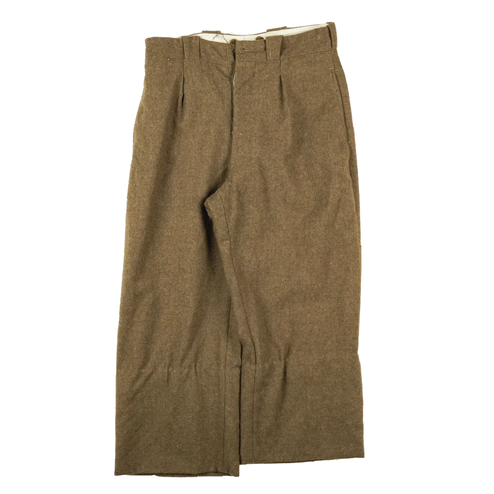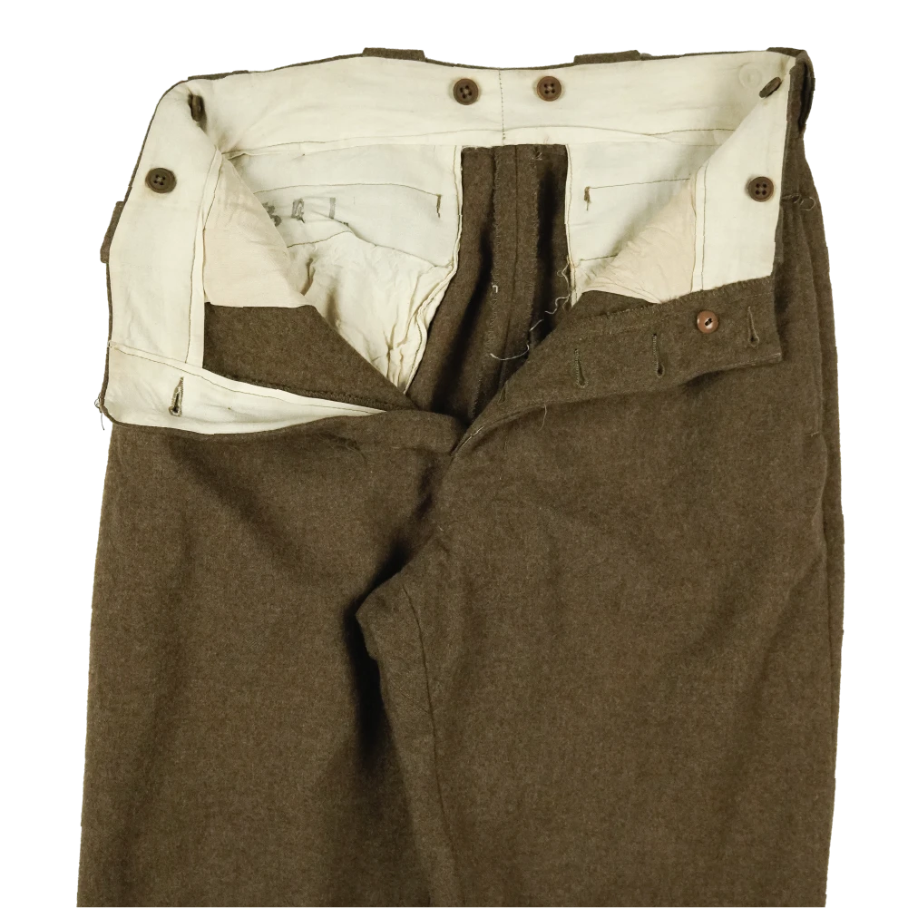 French Army M52 wool trousers in surplus condition. Classic military-pattern wool trousers with a traditional buttoned waist.