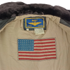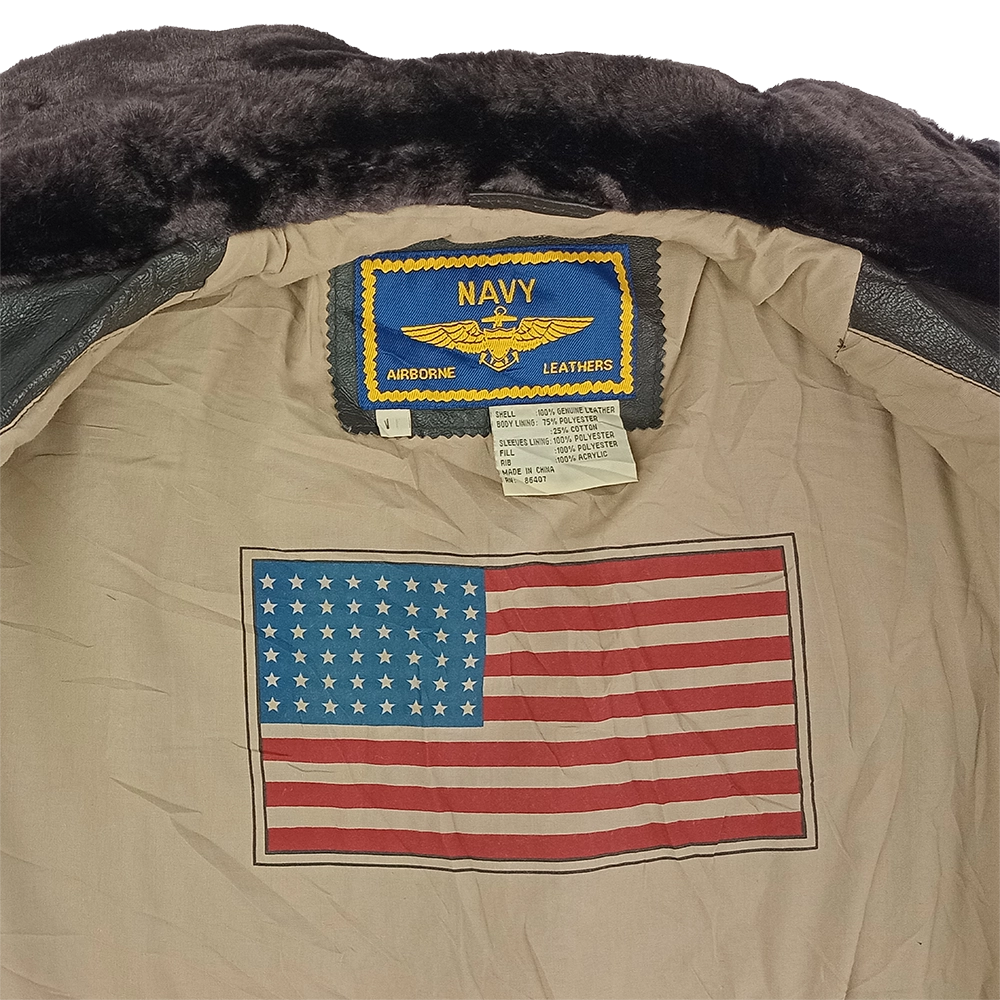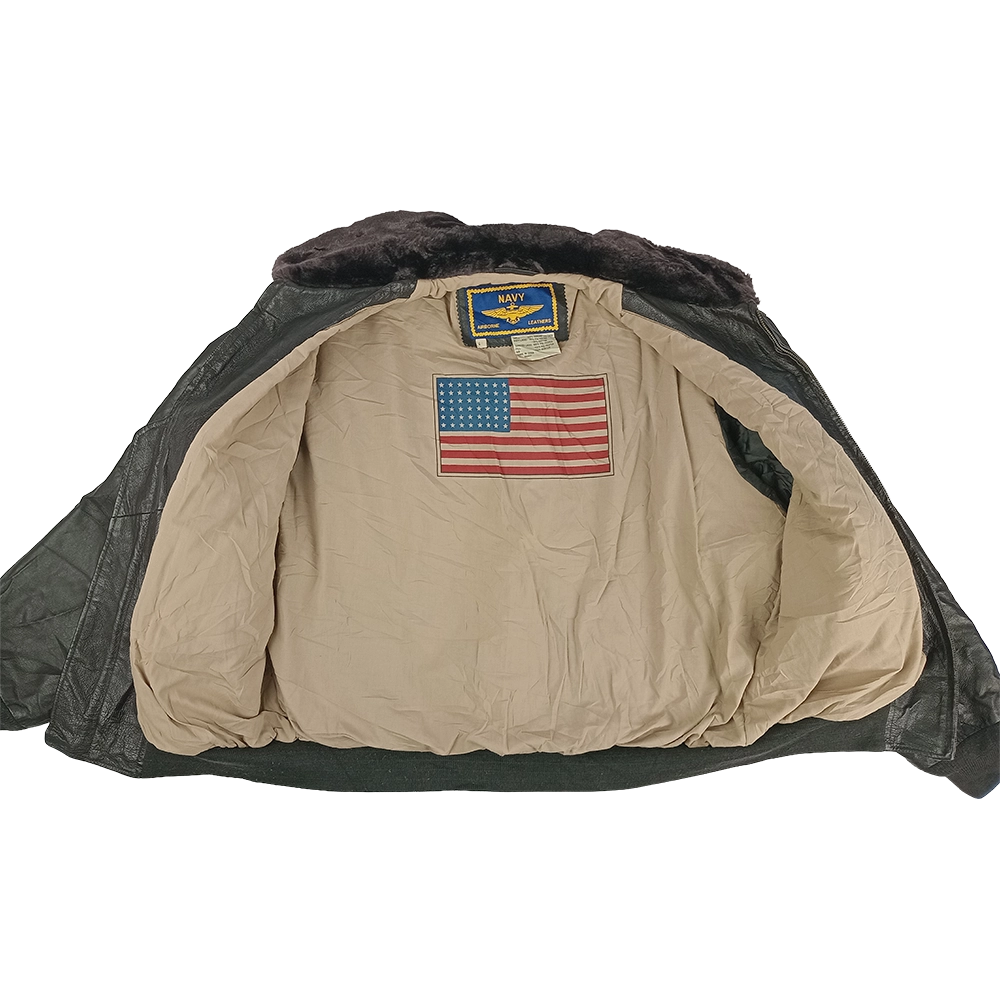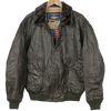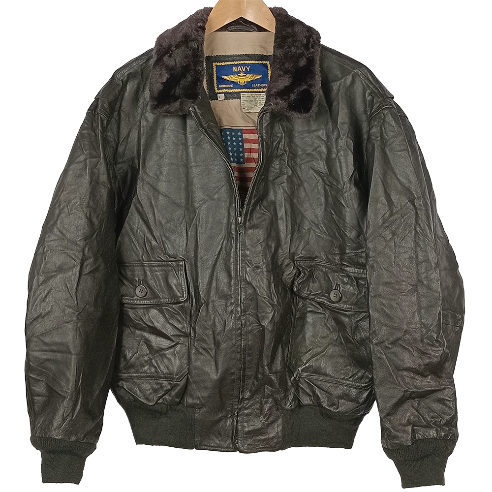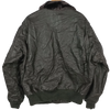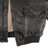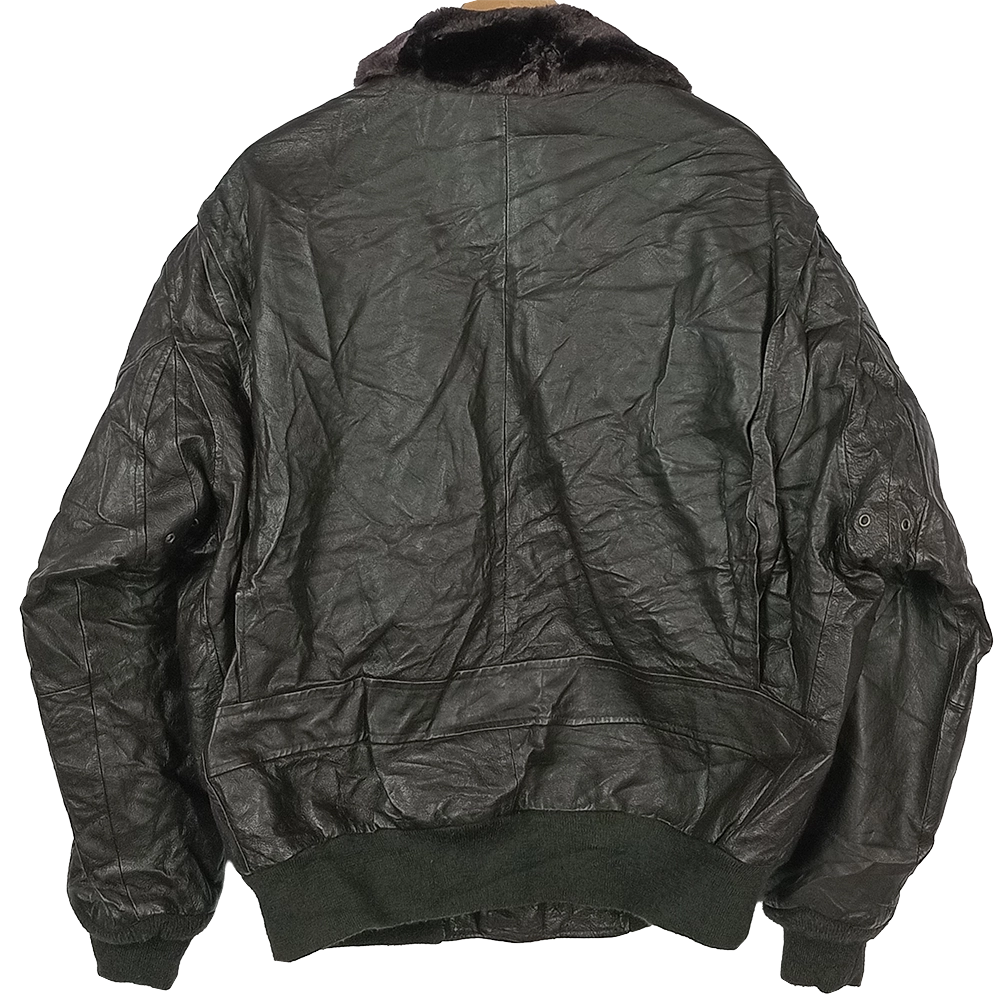 G-1 Leather Flight Jacket in size Large. Commercial example featuring a faux fur collar, elasticated wool cuffs and waist, and two front hip pockets with flaps.