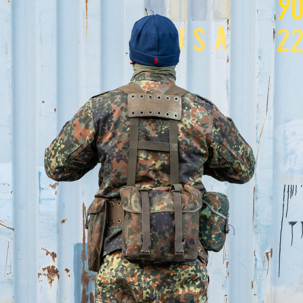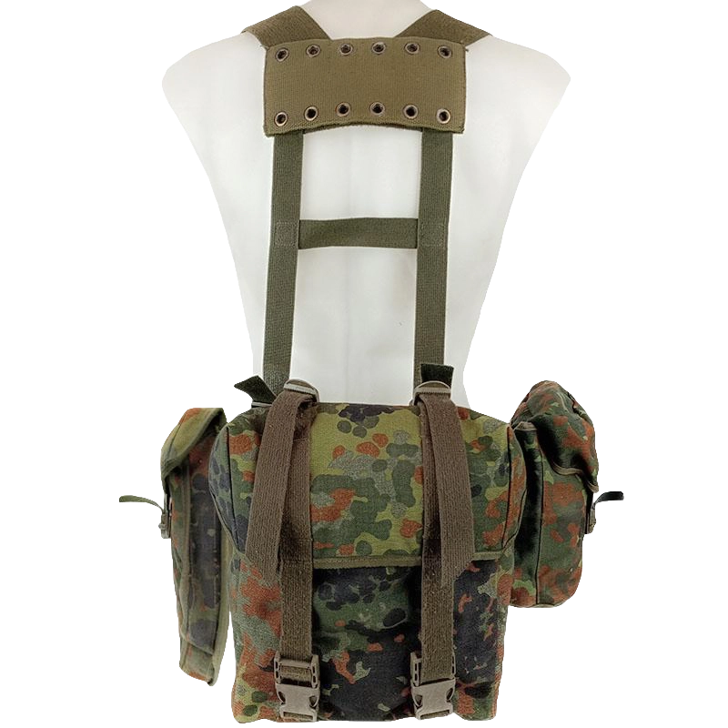 It's the flecktarn starter pack! Consisting of a German Flecktarn combat pack (butt pack), Flecktarn canteen cover and a Flecktarn entrenching tool pouch held together by a sturdy Bundeswehr webbing system. A great base web-set for hunters, paintballers or airsofters. Flecktarn assemble, GO!