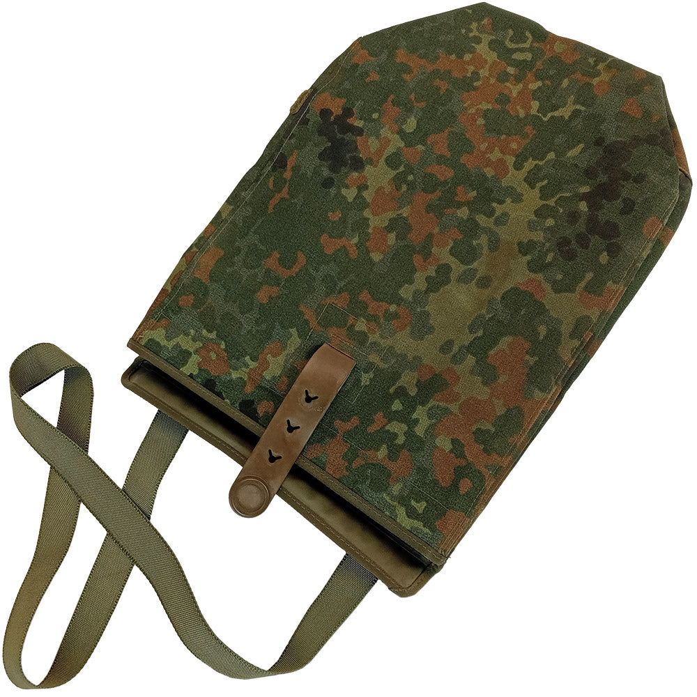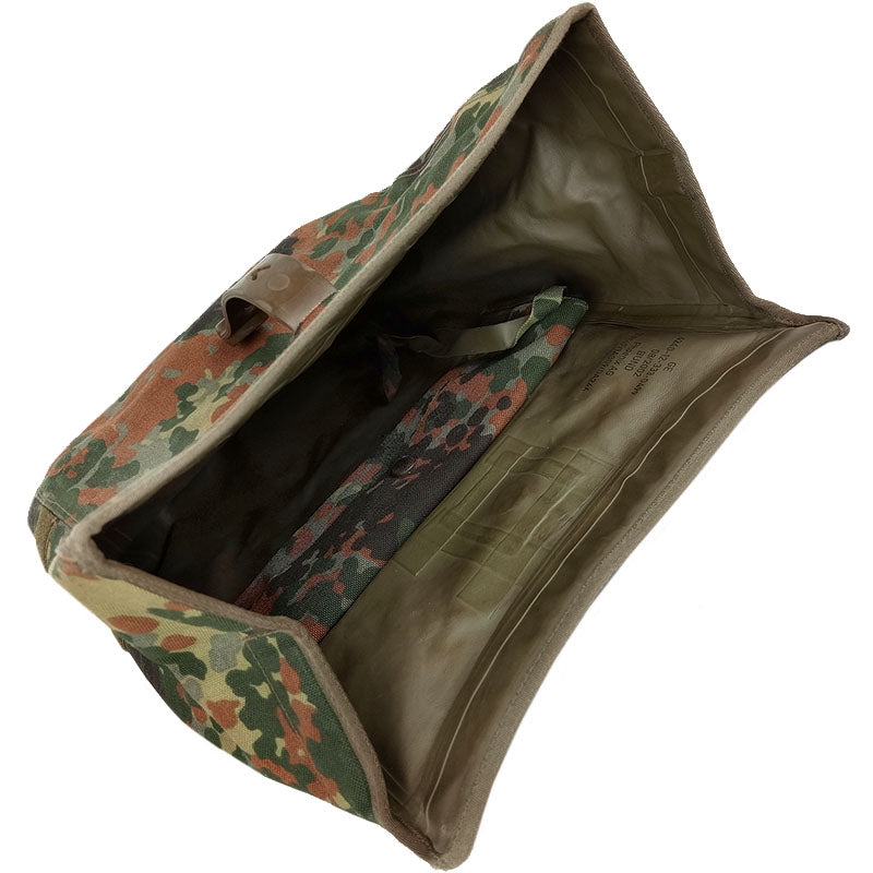 The bag is opened by pulling on and releasing a rubber strap and unfolding the top. Storage is simple - just one main compartment with a small sub-pocket to store things like spare lenses etc. You can carry this bag over your shoulder with a fixed length strap or you can unpick it and integrate the bag onto a Bundeswehr web belt system, using the attachments on the back.
