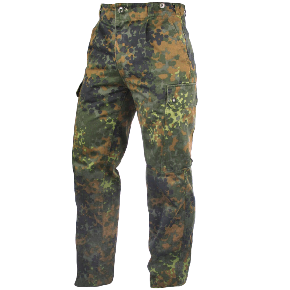 Here we have some genuine German army Funf Farben Tarndruck der Bundeswehr (Five color camouflage of the Bundeswehr) or simply Flecktarn camouflage Trousers. Made from a blend of cotton/polyester, these trousers are comfortable and hard-wearing.