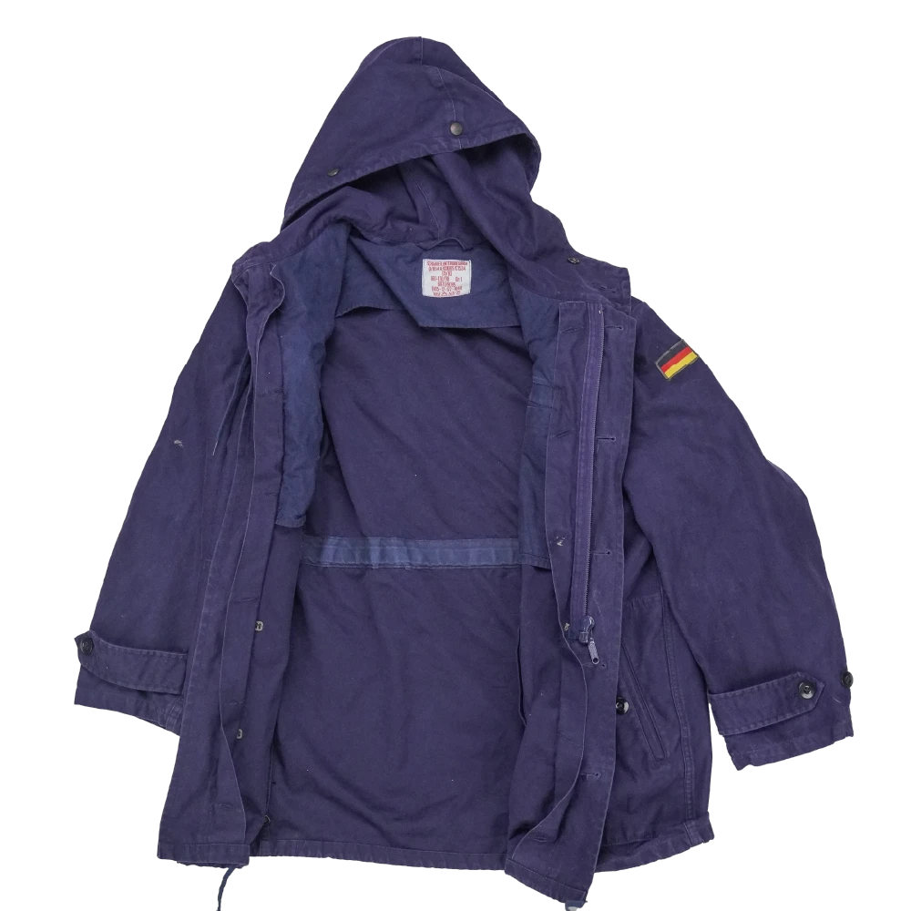 German Navy parka without liner in a small size. Full-length outer shell with a hood, front closure, and multiple front pockets.