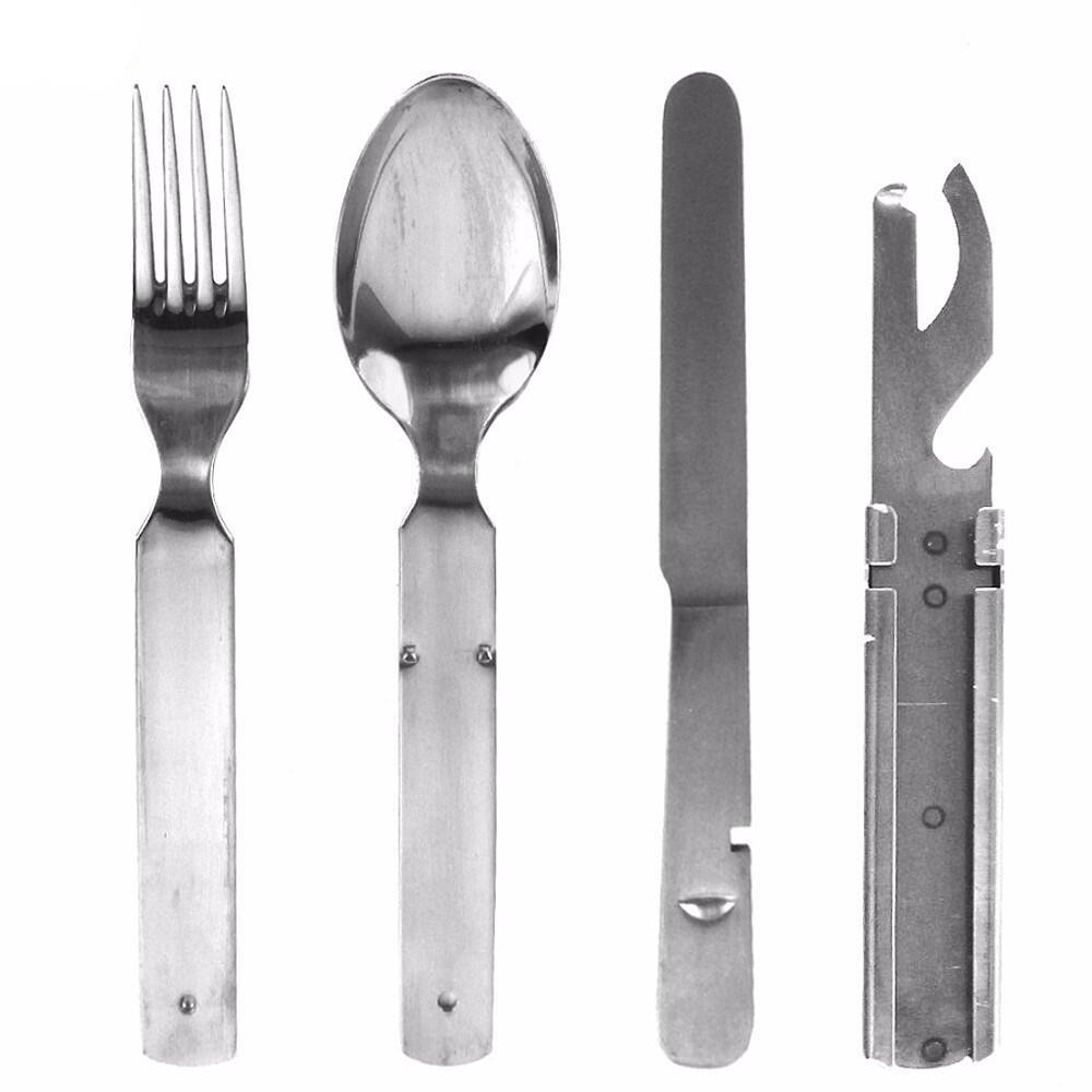 This ex-military cutlery set is made from high quality German stainless steel. Stainless steel is a strong metal that cleans easily and won't rust. The set comprises of a fork, knife and spoon. Plus a combination can and bottle opening tool. All of the utensils lock together inside the shell of the can opener. All used sustenance components are display/prop/collectable only and not for consumption use.