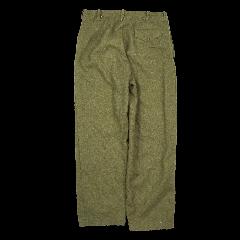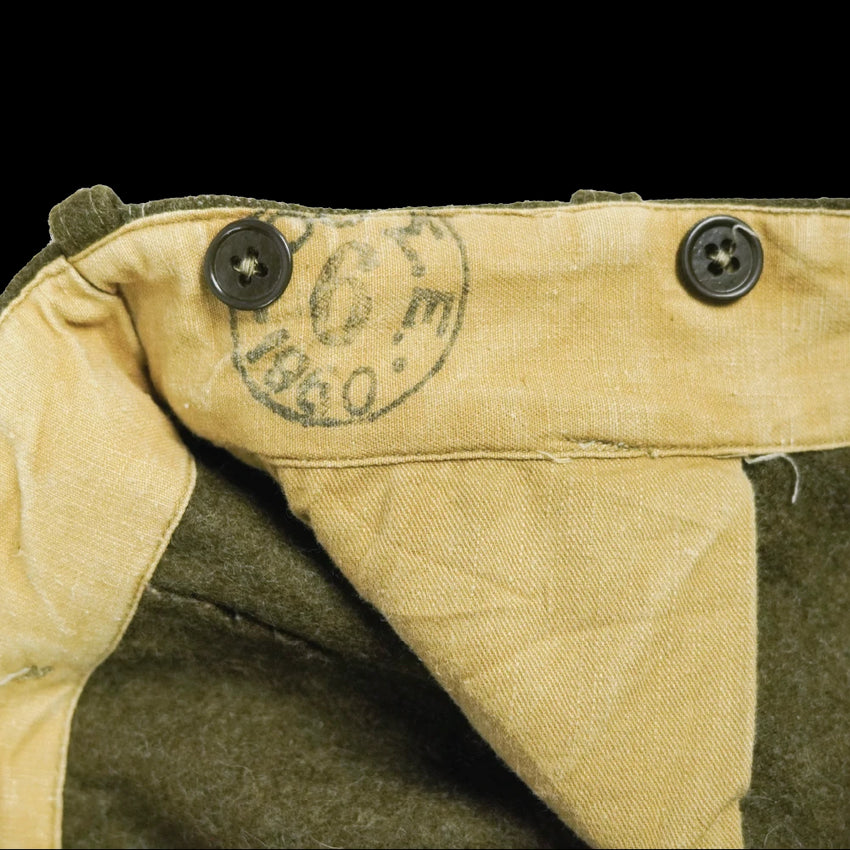 Greek Army wool BD trousers with a 1960 manufacture date. Features include open waist pockets, a rear right pocket, a front-facing thigh pocket, and an upper leg field dressing pocket. Buttoned leg cuff adjusters are present.