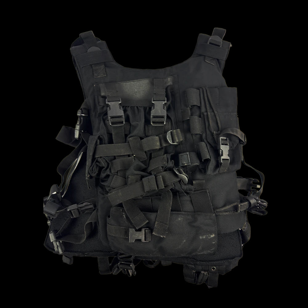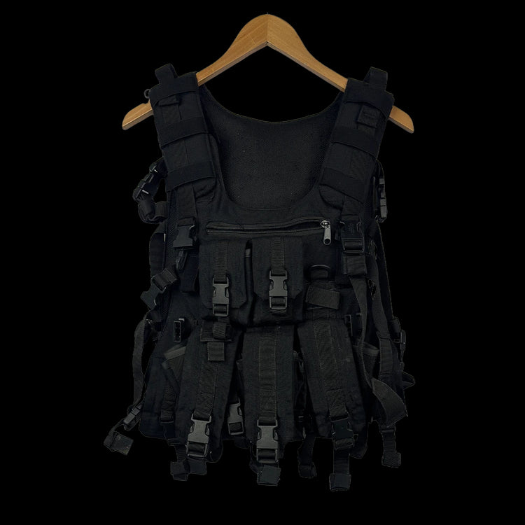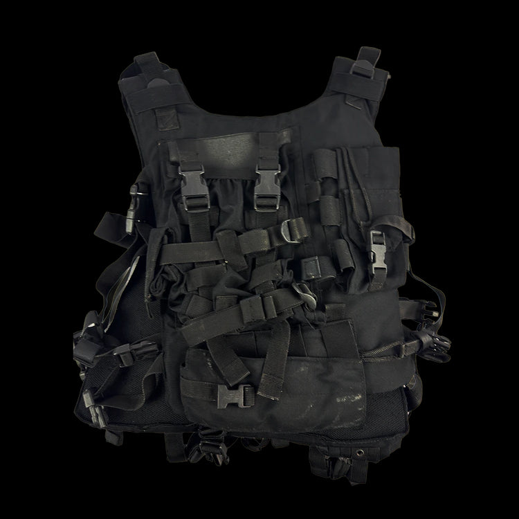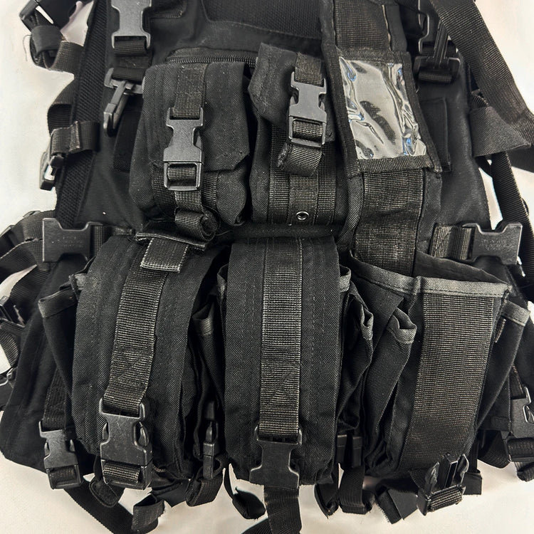 Black tactical vest with a large-capacity layout designed to carry multiple magazine pouches and equipment. Features storage areas intended for magazines, grenades, a canteen, and a radio, with ITW-branded buckles fitted throughout.